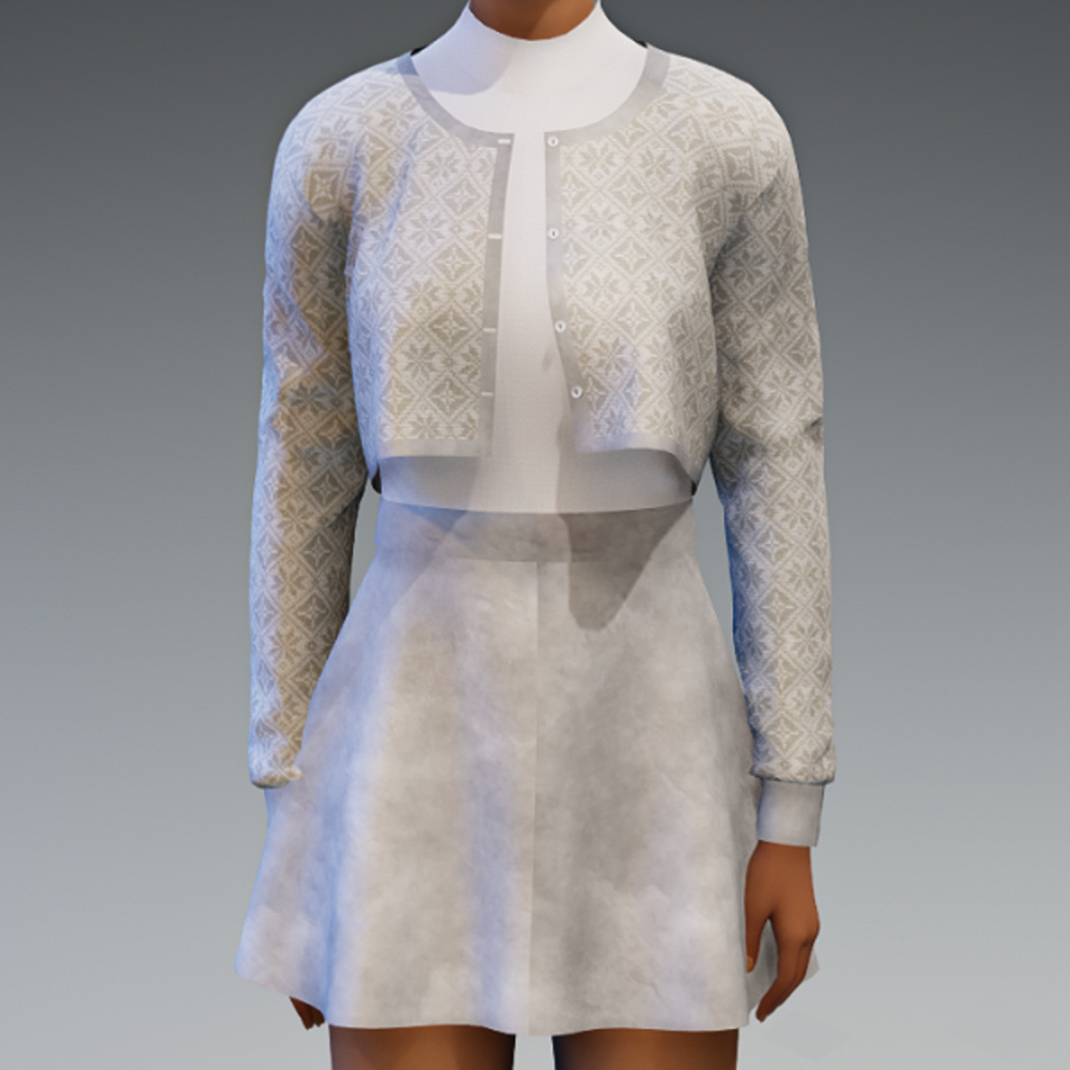 Three piece all in one set. Knit jacket with leather trim, coordinating buttons and button holes. Shirt fabric is plain and can be seen in the demo. Skirt matching leather. Try the demo. Avatar 2.0