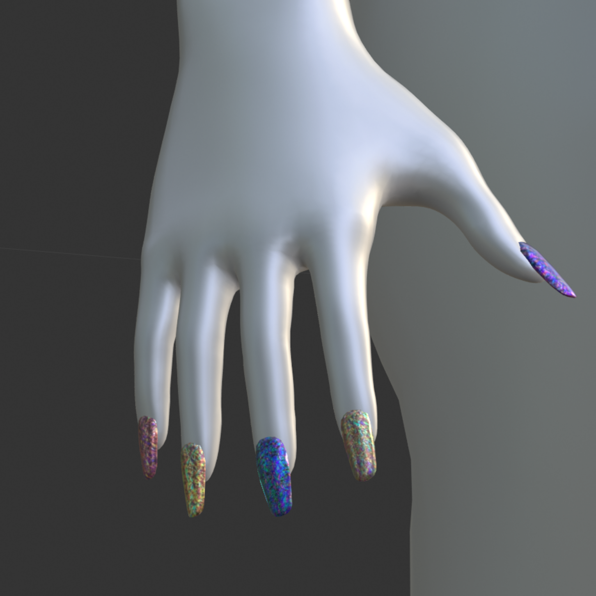 Iridescent Metal [Style 01] Long False Fake Nails for AV2 Female. Developed based on the standard base avatar to completely cover the ugly basic nail. No other items or kits necessary; just equip and look fabulous! Shows in inventory as a clothing item. Fully rigged, so will move with your avatar. If you want different colours, then please contact me in Sansar or Discord.