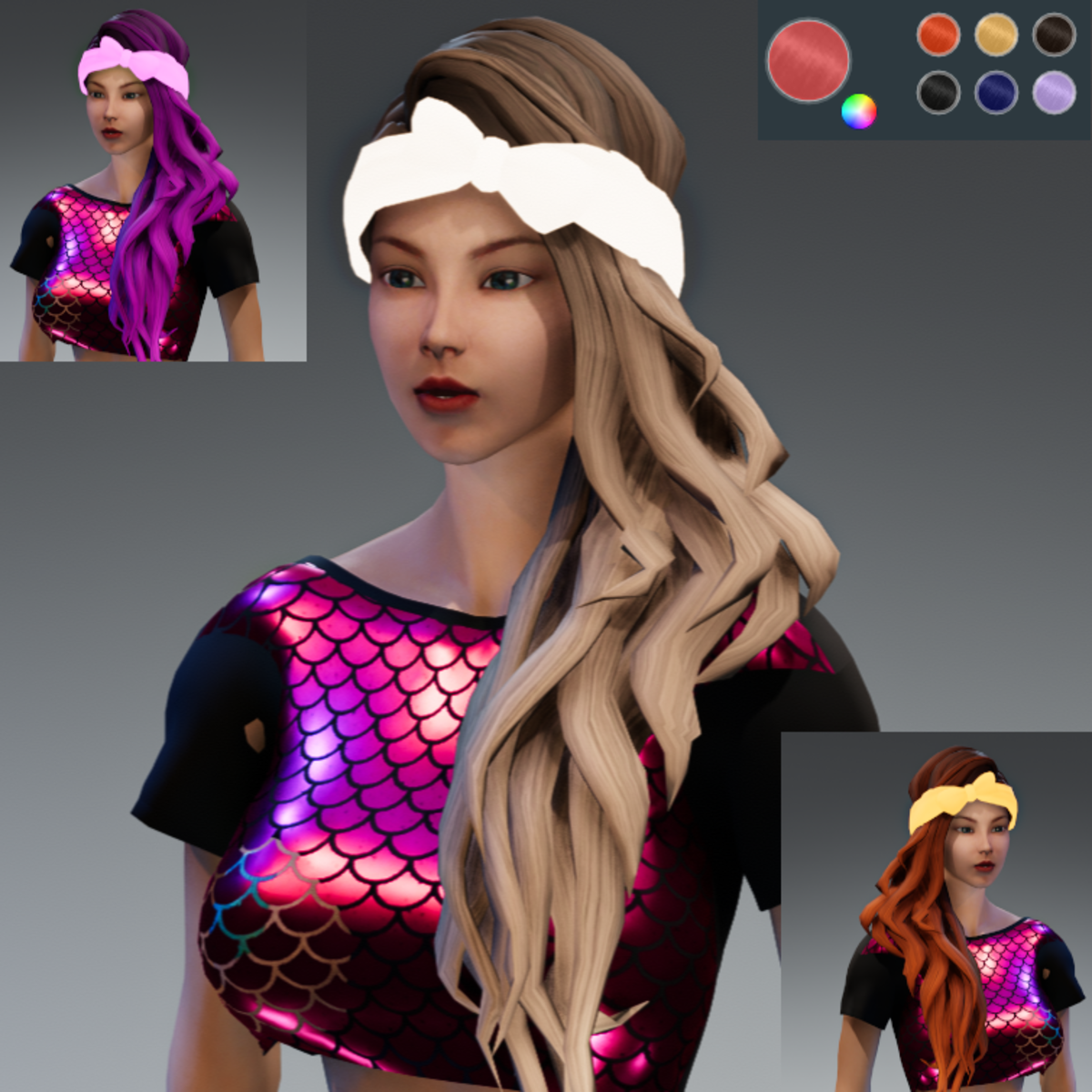 Hair and Headband that can be colorized. Just see my items in my experience: https://atlas.sansar.com/experiences/acpixl/acpixl-animation-avatar-store