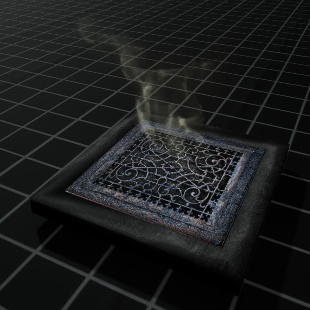 Victorian style gutter grate with built-in subtle steam exhaust particle effect.. great detail prop to place around historical era victorian cities or similiar..
