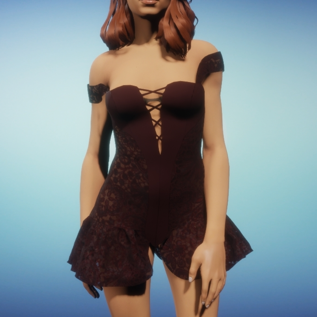 Front laced leather corset with lace panels and skirt. The embroidered lace is applied to a netting with transparency. Be sure to enable animate cloth when wearing this garment. The sleeves can easily be worn on top of the shoulders or tugged to fall gracefully onto the upper arm.