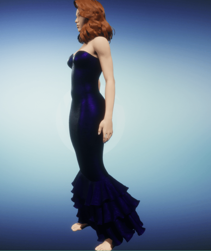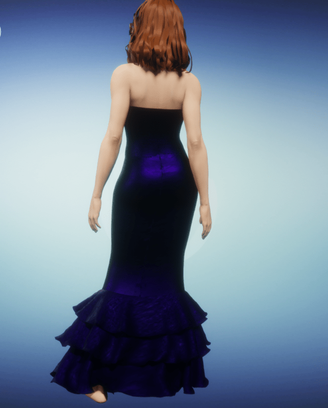 Classic mermaid dress as introduced in the 1940's. Skin-hugging strapless satin sheath dress with frilly layers at the lower edge. In cobalt.