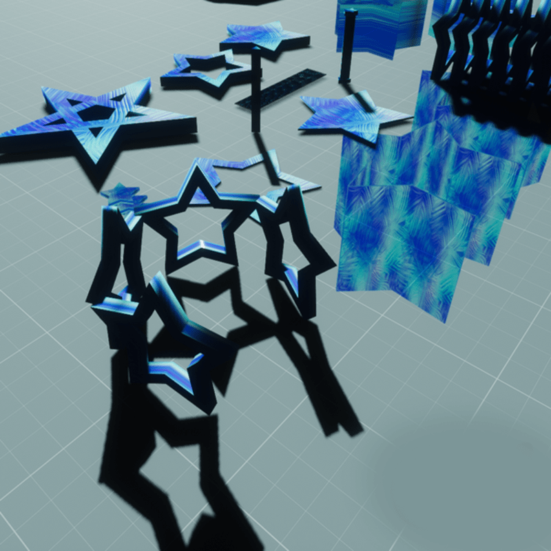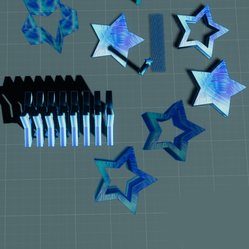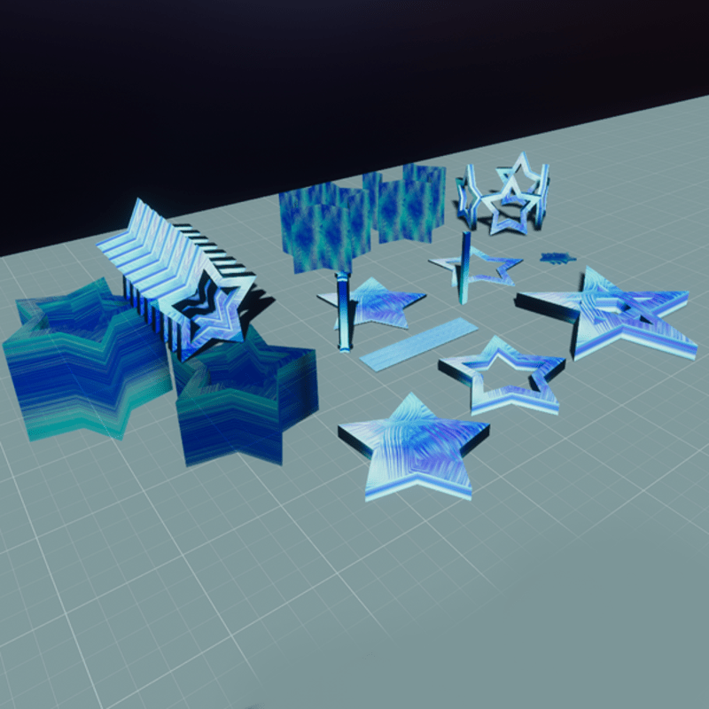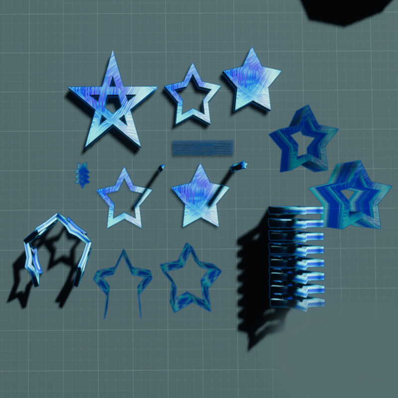 A set of building elements in the form of five-pointed stars for the construction of houses, skyscrapers, dance clubs, shops. And also for decorating exhibition and shopping areas. The set includes 15 parts: stars of different thicknesses, columns, lattice for creating pendant passages, a small staircase (by connecting several such stairs, you can make a higher and longer one), thin and thick glass walls, a ring of decorative windows, a "star" tunnel. You can change the sizes and materials of the models as you wish. Full perm.