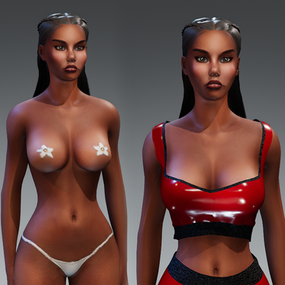 Emanuela is a beautiful realistic female avatar. She has bigger breasts and is thicker than Nina avatar. Most hair should fit her head, only some long hair covering her breasts may not fit. All flat shoes should fit her foot. Also, all clothes made with Marvelous Designer should fit her body. Hair and clothing are not included. Try the demo, just in case :) https://store.sansar.com/listings/347f4bf1-9412-41bb-b42e-514268f4a59a/emanuela-avatar-dark-demo