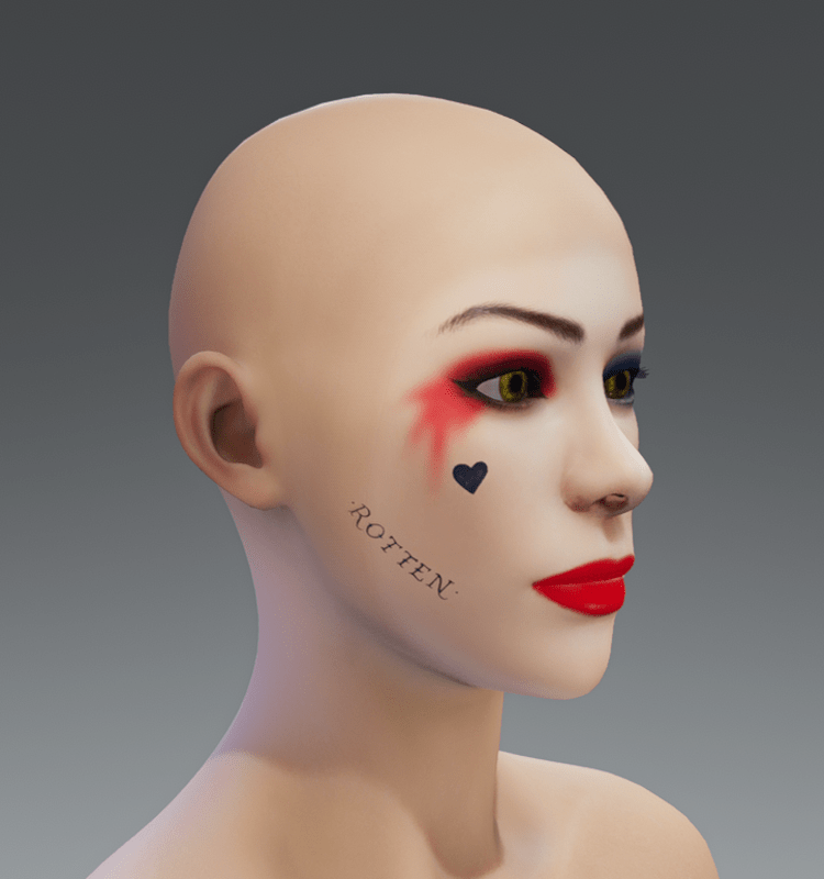 ☆Harley Quinn style makeup ☆ ♚Make your Avi swag again♚ -Default avatar face skin addon- -Fully rigged- -Fit any face deformation, set all face slider to 0 for best results.- -Top level textures- -See "Skin DEMO" for testing and istructions. ★reviews greatly appreciated ★ Flex your experience!