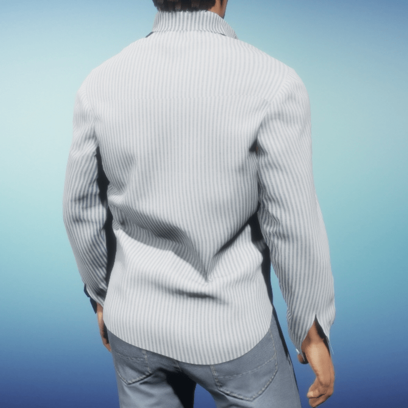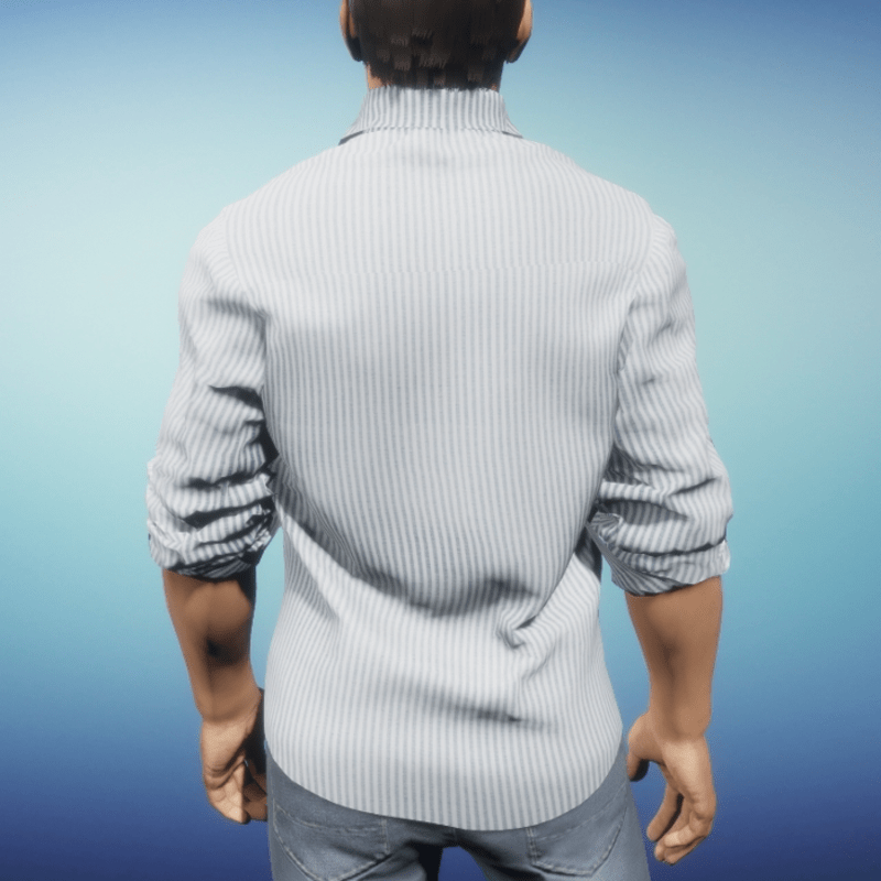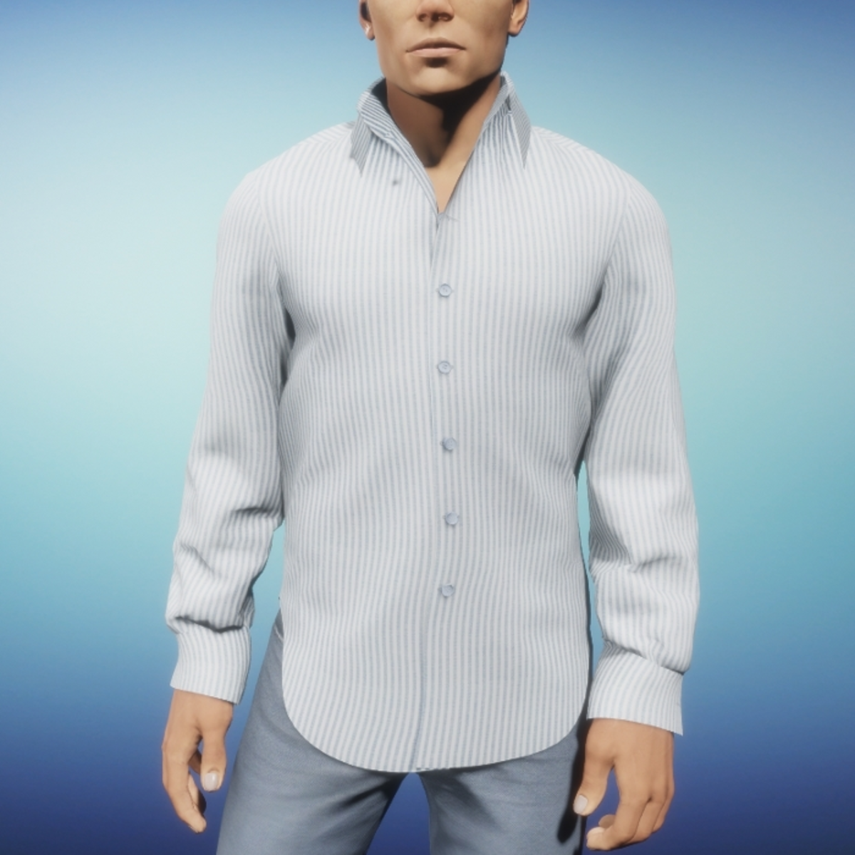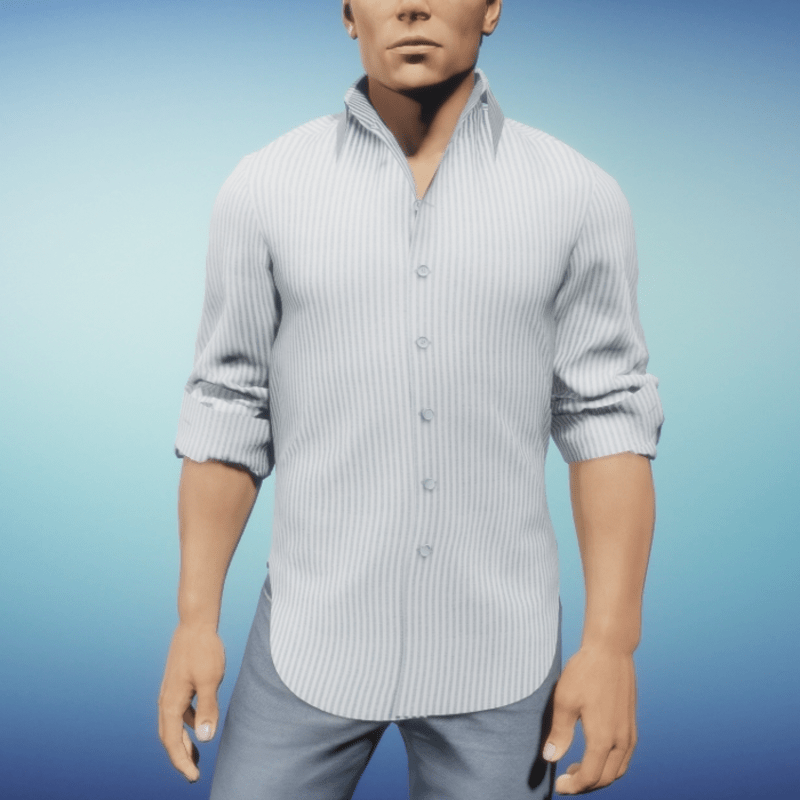 Classic button down shirt in relaxed fit. Top two buttons are unbuttoned, cuffs hang loose, and shirt tails can't be tucked in. Wear this with sleeves hanging loose or roll them up using simulate cloth in the Lookbook.