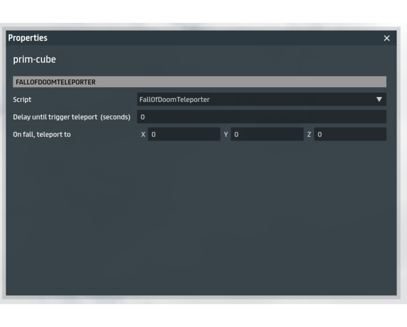 When running over the edge of your scene, you end up falling into the abyss for what feels like eternity, aka the "Fall of Doom", only to be teleported back to the spawn point, which may be undesired. This teleport script will teleport any avatar to any desired position in the experience when it detects the avatar is falling to its doom. Only one needs to inserted in the scene, inside any object. Just configure the script properties. * I allow buyers to resell this script as part of their own products, but not as a standalone script