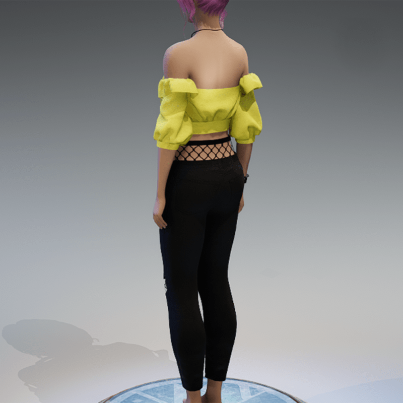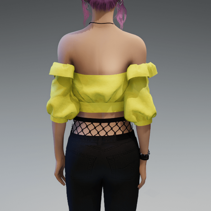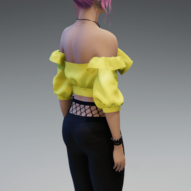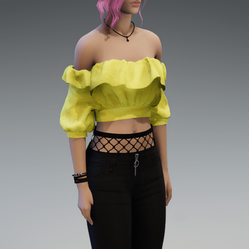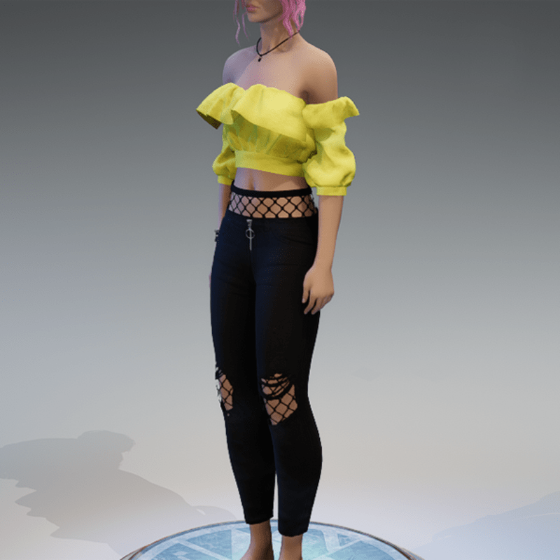A full outfit, including the black denim pants with some fishnet-applications on the knees and the top of the pants, as well as the 'flutter' shoulderfree top in yellow! If you're not sure about how this outfit will look like on your avatar, please use my free 'siggys store' version first before buying this one! Enjoy!