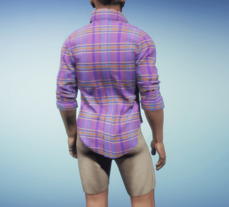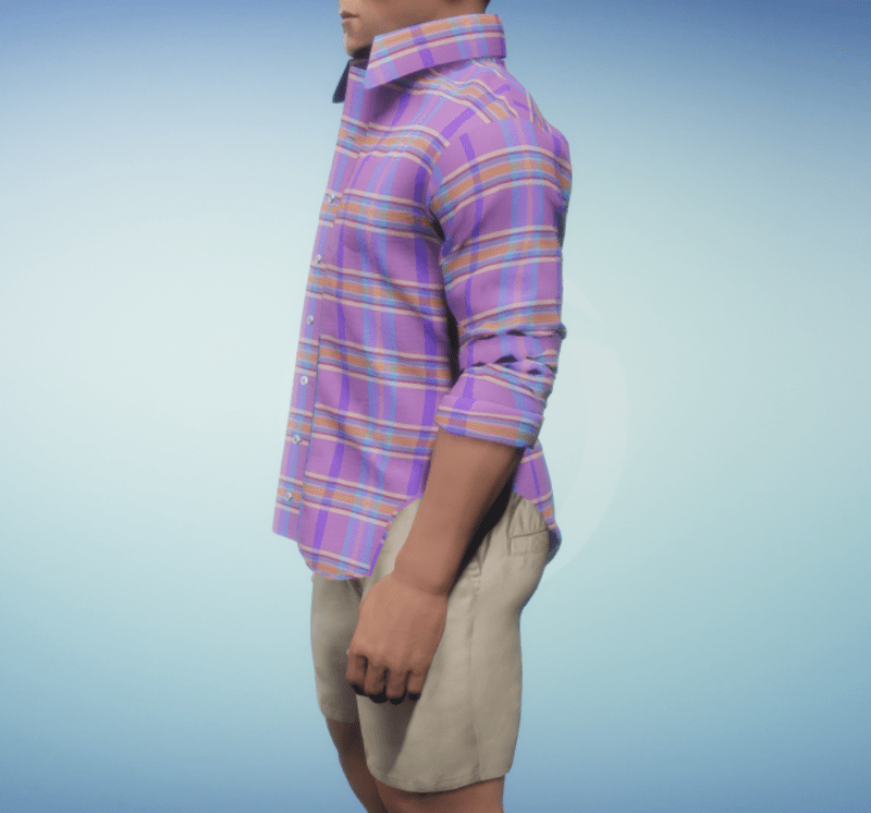 Longsleeved men's cotton casual shirt, featuring a brightly-colored Madras plaid pattern. Fabric wrinkles very realistically.