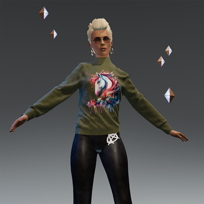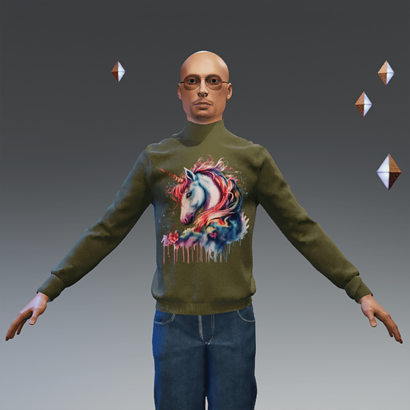 Olive sweater with unicorn print. Textured fabric quality. Created with female avatar 2.0, fits successfully on male avatar. Please do not forget to rate this item
