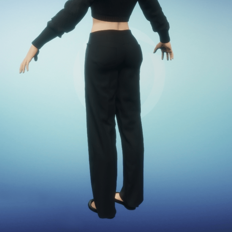 Women's dress slacks with front closure, welt pockets and back patch pockets. Front and back center legs have gently pressed folds for a dressy appearance. Be sure to animate cloth when wearing these slacks. Also, when layering, wear top layers first and then add lower layers. So if wanting to tuck in a shirt, where the shirt first then the slacks. If wanting to wear a top over the slacks wear the top first.
