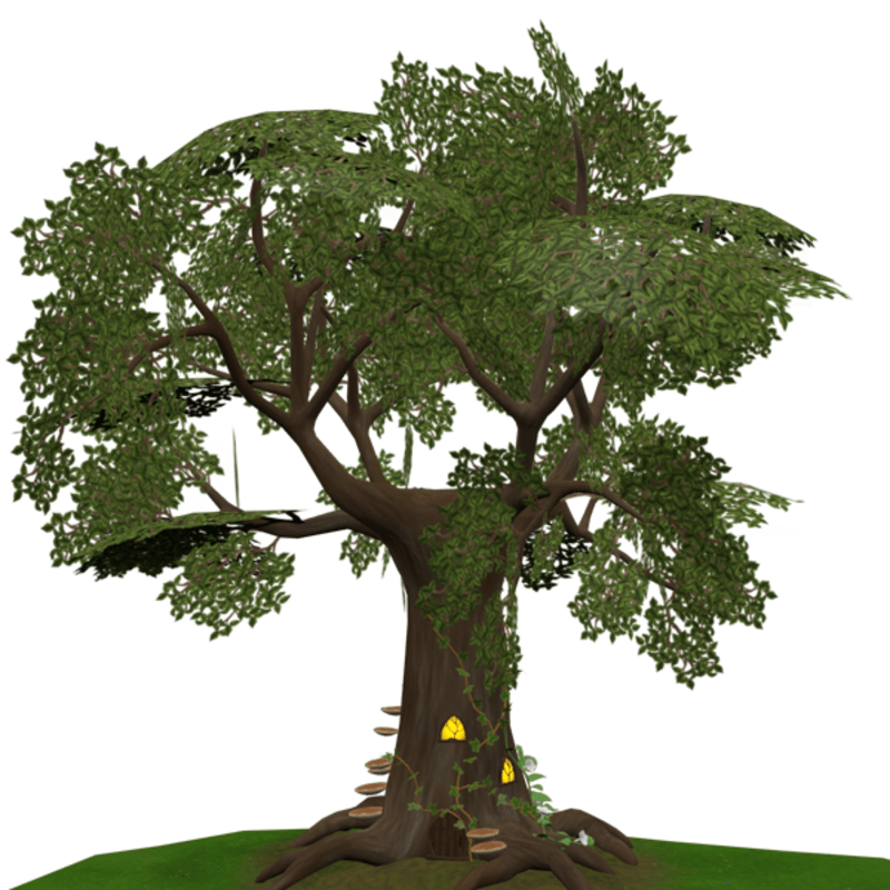 a big tree with elven door,windows,climbing ivy,flowers and mushrooms.The tree trunk has physics,collision