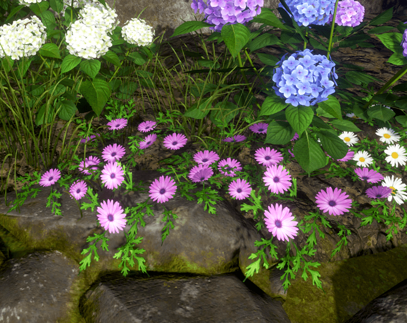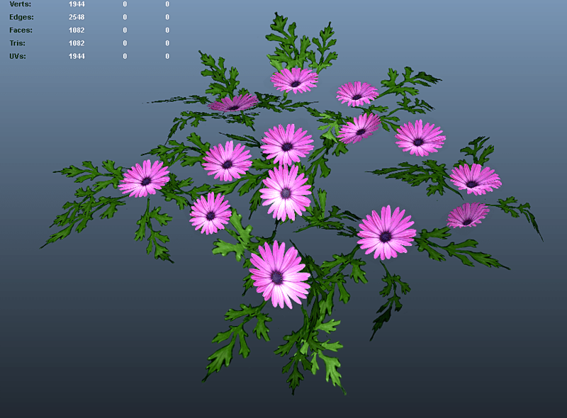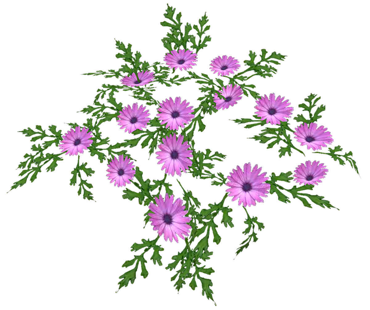 Lilac daisy flowers and leaves, no stems. These flowers look good on a dark background like soil or in shade. Arrange on an angle for better effect. See images. See in Sansar experience - https://atlas.sansar.com/experiences/reidparkin/reid-s-plants Poly count = 1082