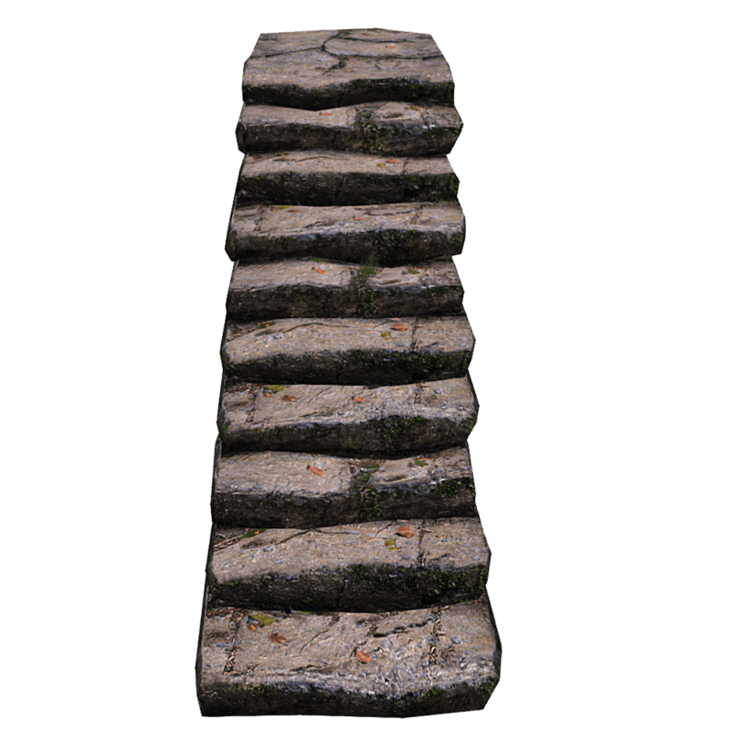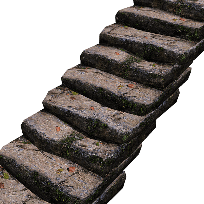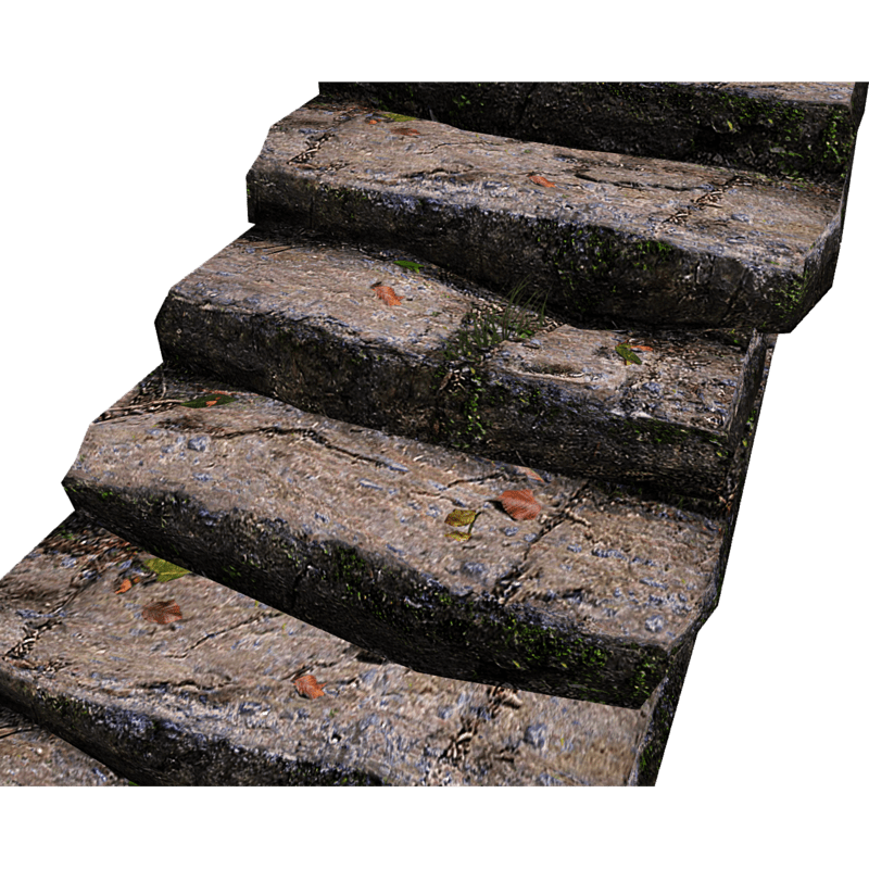 Old stone steps, weathered with moss, leaves and grass. Ten steps. For those hills and mountains Polycount = 656 triangles; Physical shape = 16 triangles. See in Sansar experience - https://atlas.sansar.com/experiences/reidparkin/reid-s-plants