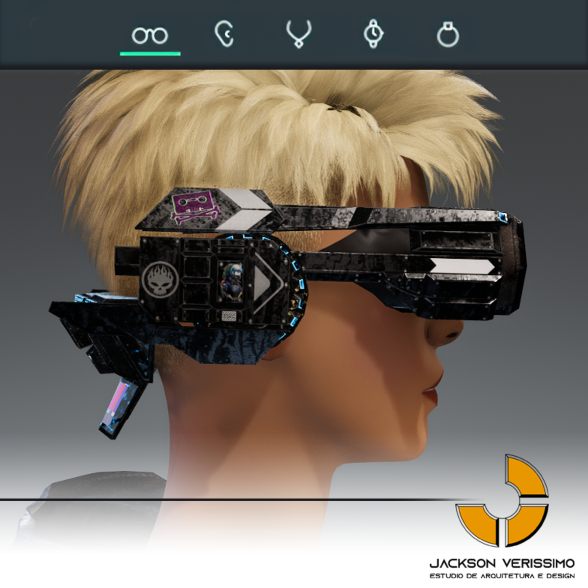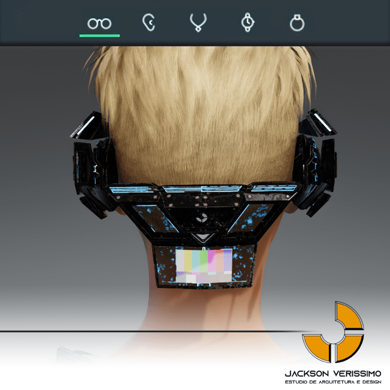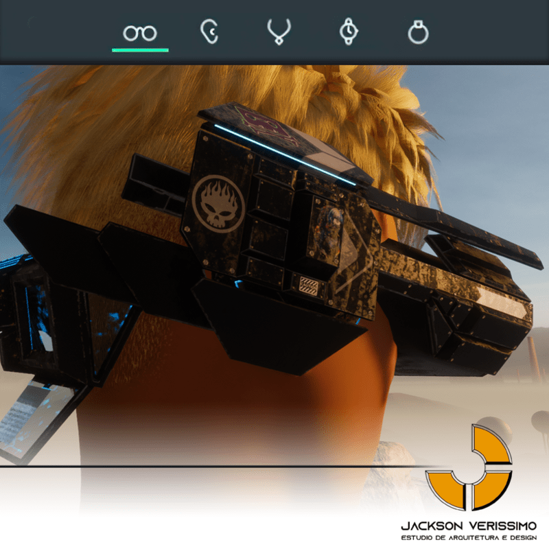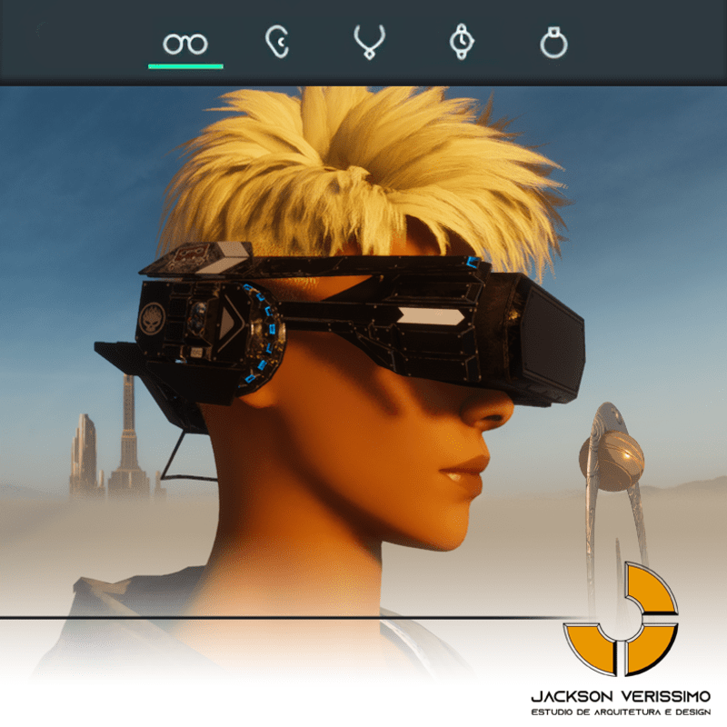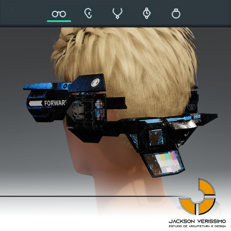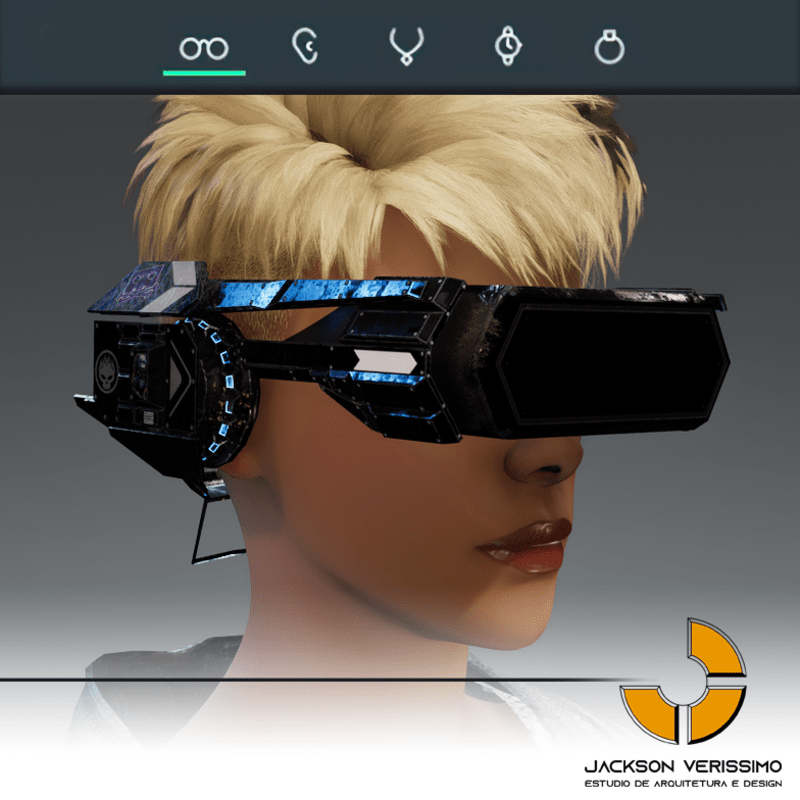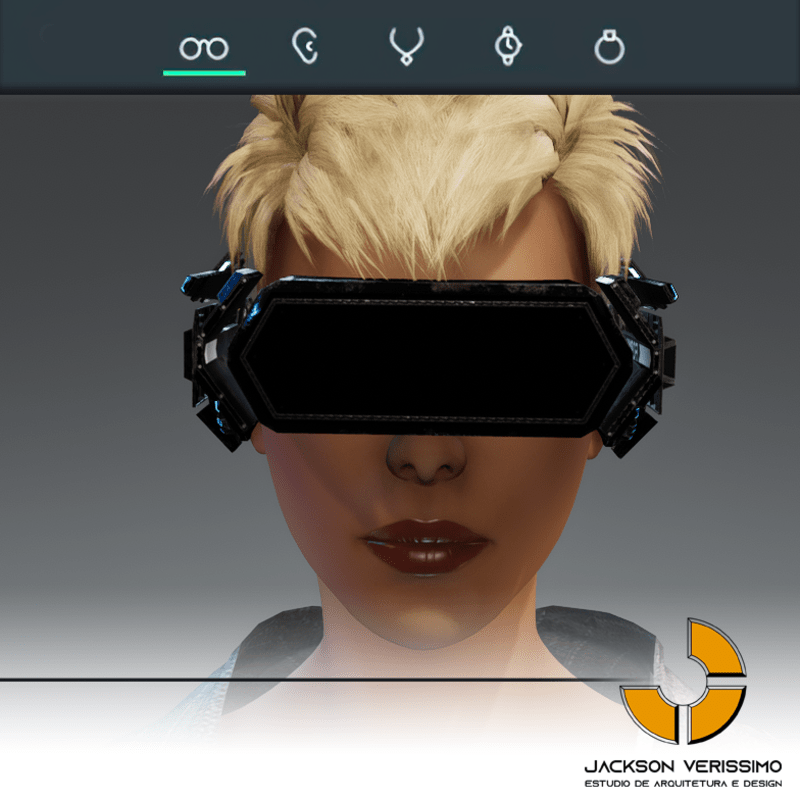 Visionary Design for a VR Headset exclusive for the Sansar Metaverse. Special and High Quality Texture. Vr glasses with headphones, Emissive lights and Media Screen. Unisex. Matches with all humanoid avatars. No need for adjustments for the default 2.0 Avatar of Sansar.