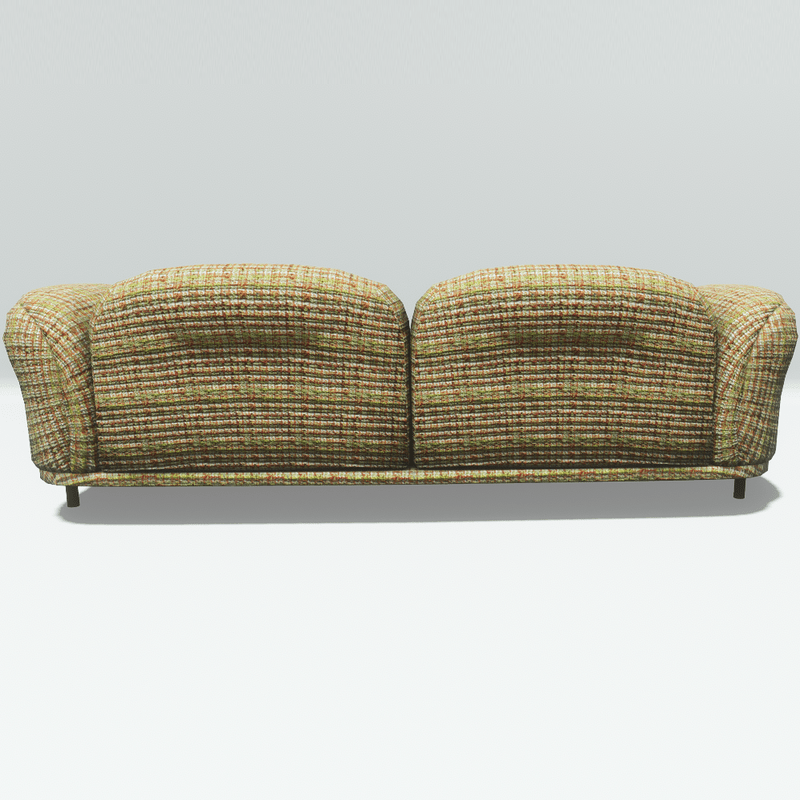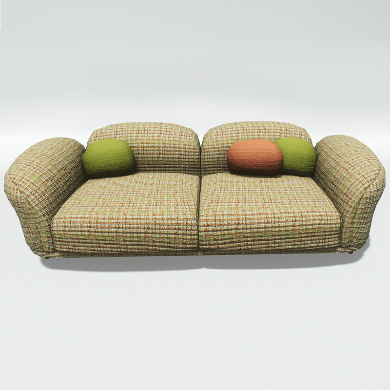 Two-seater sofa with rounded corners and fabric upholstery in white, green and red shades. It has three decorative cushions with a rounded shape. It has collision and editable materials. You can get a close look here: https://atlas.sansar.com/experiences/luise/studio-lamda