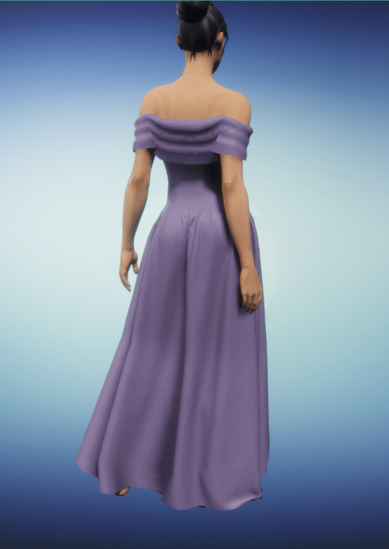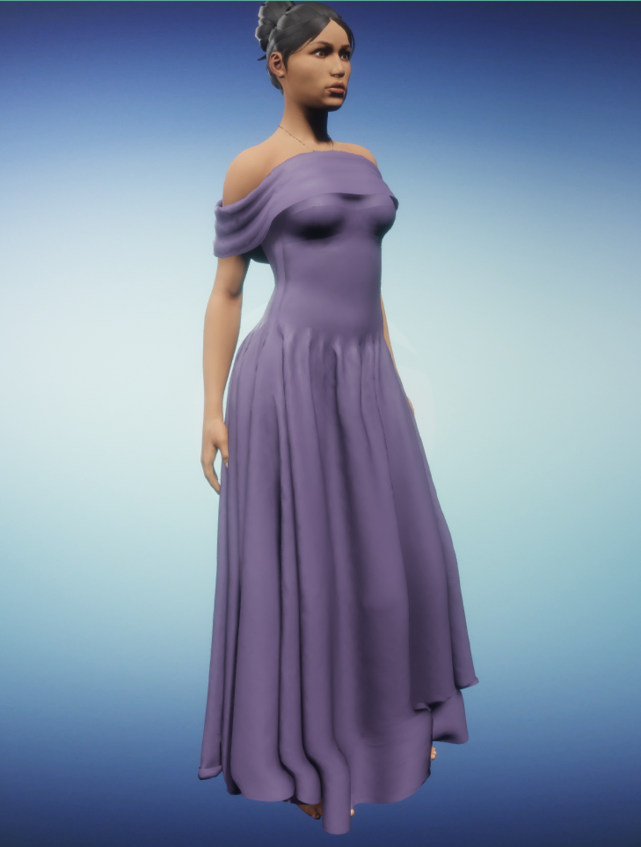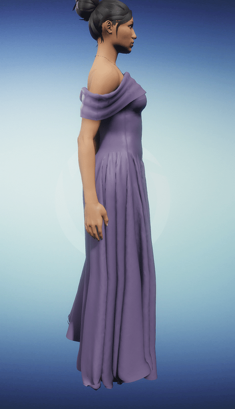An off-the-shoulder draped collar ballgown with fitted bodice and gathered full skirt. In iris-colored satin.