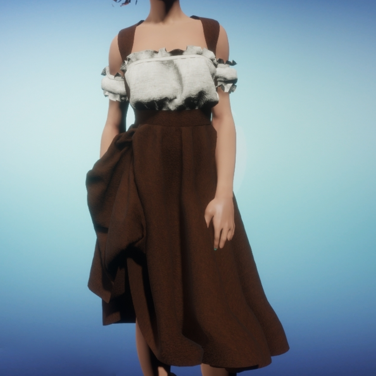 One piece peasant blouse with pinafore skirt. Fabrics are rustic open weave wool in off white and brown. Be sure to simulate cloth when wearing.