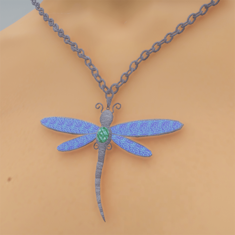 A wearable necklace with a dragonfly pendant. The height is adjusted to fit female avatars.