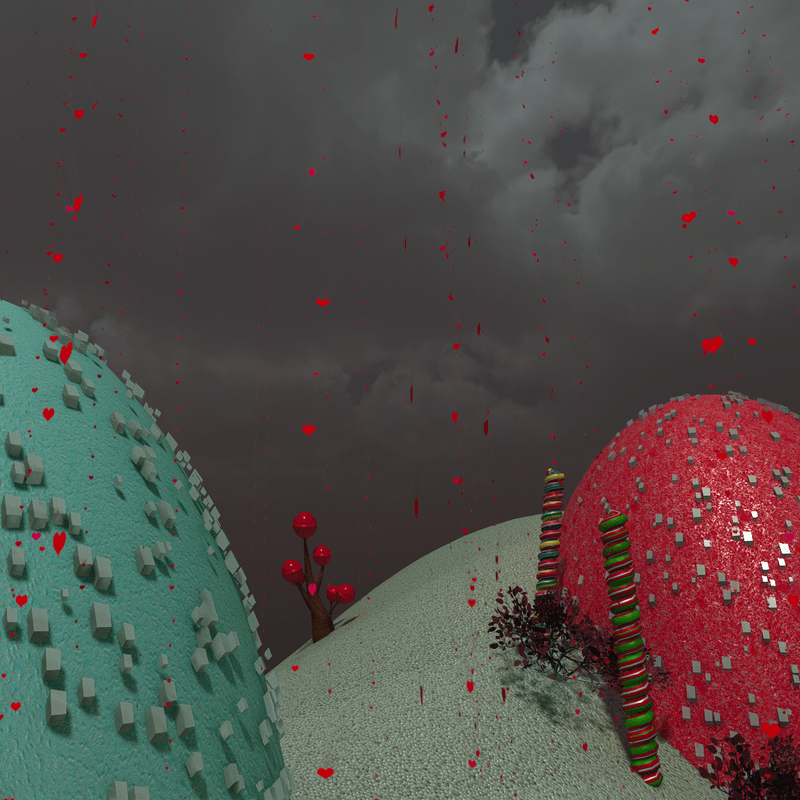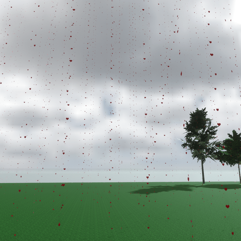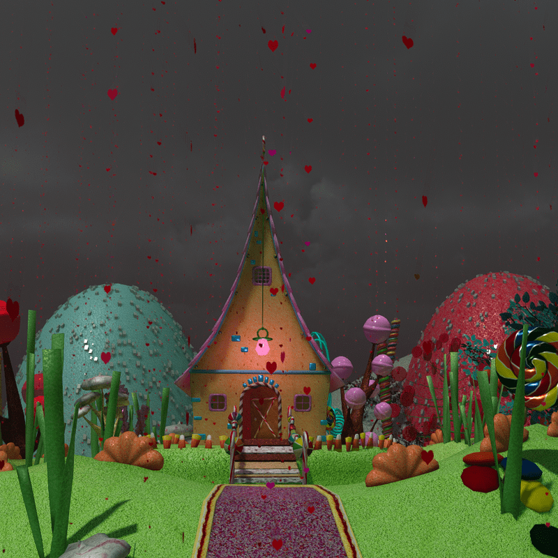 Animated hearts. They cover almost (40 X 40 X 30) m area. Keyframed multi part object, all animations are visible after scene building. If hearts passes through buildings or other structures, select in edit mode the parts you don't need and delete them. You can take a closer look here: https://atlas.sansar.com/experiences/luise/candyland