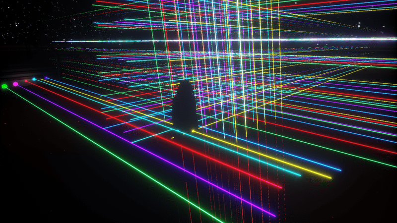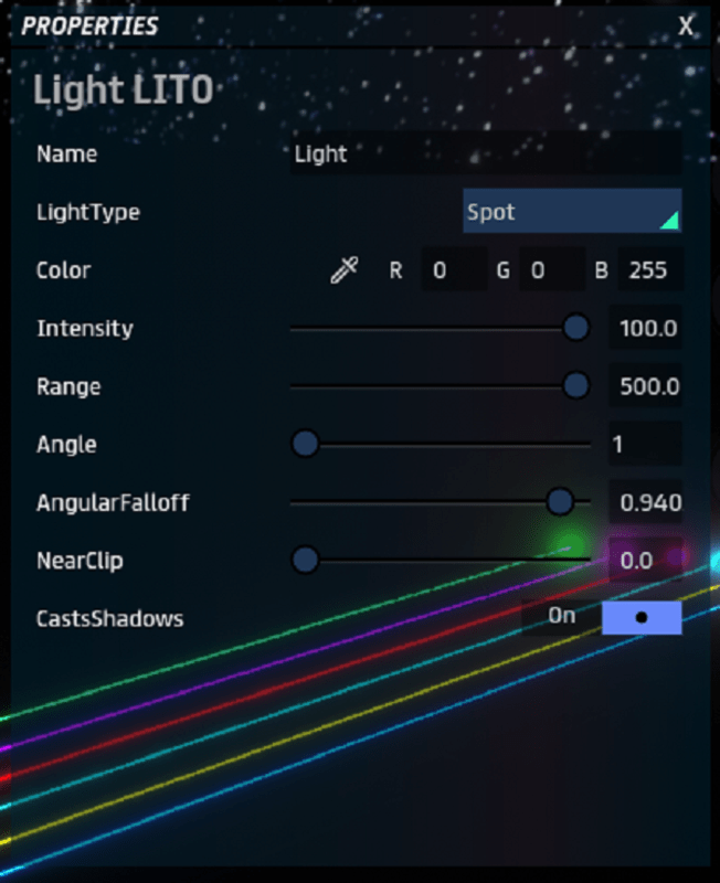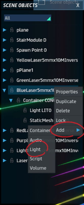 5 milimmeters Diameter (0,2 inches) 10 Meters Lenght (32 feet) only 4 polygon faces with emissive face textures 128 pixels. Duplicate, move along Y axis to make laser go further. Check Laser Showcase on: https://atlas.sansar.com/experiences/gfcprogramer/laser-showcase The laser is cool by itself but can get better: Setting up light laser pointer using spotlight: To ad pointer at end, add spotlight on this object in "scene objects" menu like on picture. Adjust light, change it to spotlight, set intensity to max, and angle 1, max range, angle fallout to max or (medium for more brightness and bigger pointer) like shown on picture. Setting up a Huge laser bloom: Change Scene-Menu-Tools-Scene Settings => Exposure bias to higher value adjusting according to your desire. Global illumination is better simulated for all computers using a low intensity point-light near where the laser pointer touch.