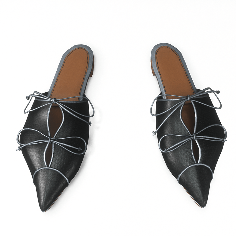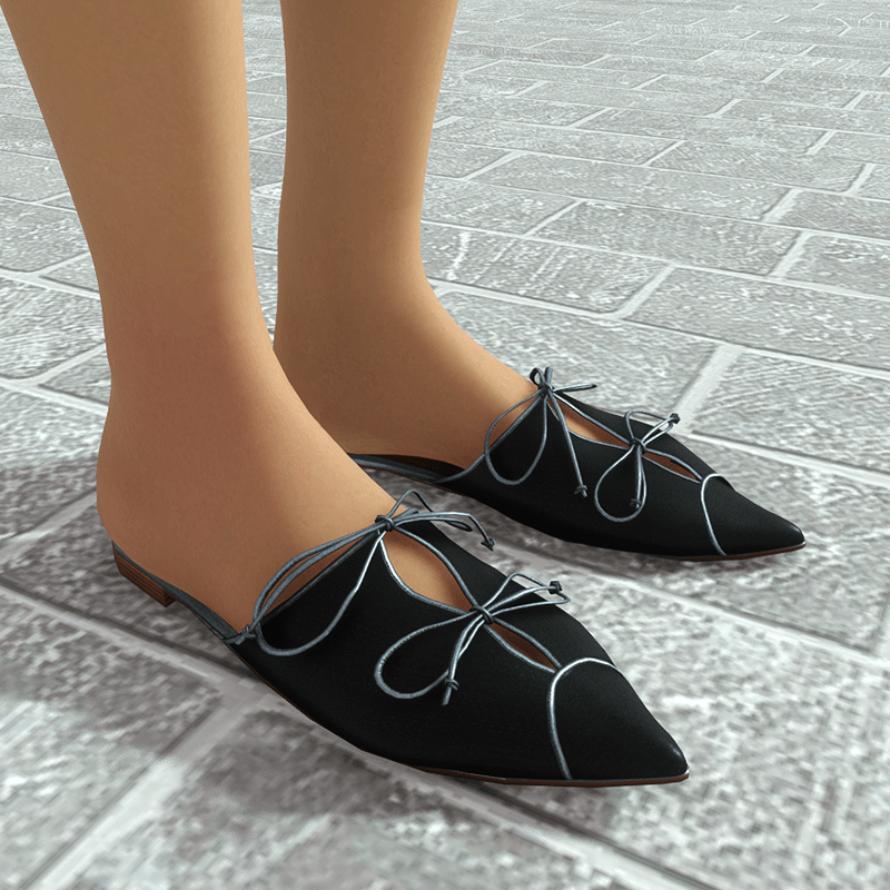 In black fabric with a sharp pointed toe, these flat woman's mules are a chic and glamorous choice. The silver - metallic leather trims and the laces that fasten in front lends a refined look that works for business or evening appearances.