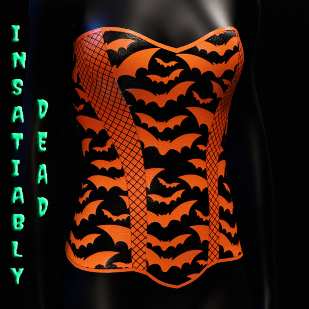 HALLOWEEN BAT FISHNET CORSET [ORANGE]. CREATED IN MARVELOUS DESIGNER WITH AVATAR 2.0. ADJUSTMENT MAY BE REQUIRED! FITTING INSTRUCTIONS CAN BE FOUND BY GOING TO THE LINK BELOW. https://help.sansar.com/hc/en-us/articles/115005693363-Fitting-Marvelous-Designer-clothing-to-your-avatar PLEASE RATE AFTER BUYING! IF ANY ISSUES OCCUR PLEASE CONTACT TEAGAN BROKKEN FOR ASSISTANCE. THANK YOU! <3 <3 GET INSATIABLY DEAD <3