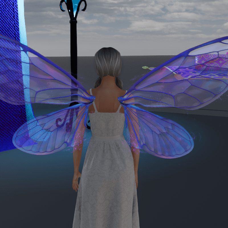Iridescent, glowing and translucent fairy wings with an animated sparkling fairy dust effect. (translucent/See-through effect example shown in second picture) Sparkling fairy dust animation example gif: https://gyazo.com/4b8f623cf1ec2b47f2e22aa22388fbf3 Fits both female and male framed avatars. A rigged clothing item so cannot be re-sized or moved. rigged to the wing attach bones so will animate with emotes that animate wings. Other colours available on store. Make sure to set your inventory to 'Show all clothing' if the fairy wings do not show up immediately for you in the clothing tab. (See the example picture on this listing for reference.) Contact "TheNick-1981" through Sansar or Sansar discord if you need re-rigging, a custom design or if there is a problem etc.