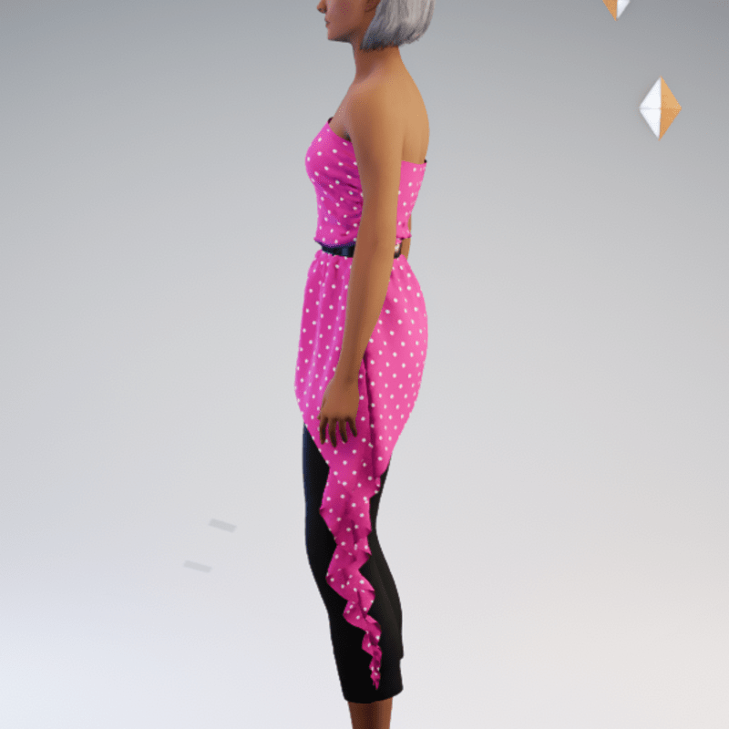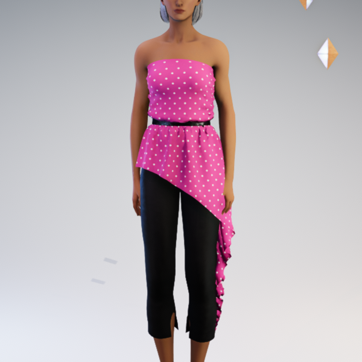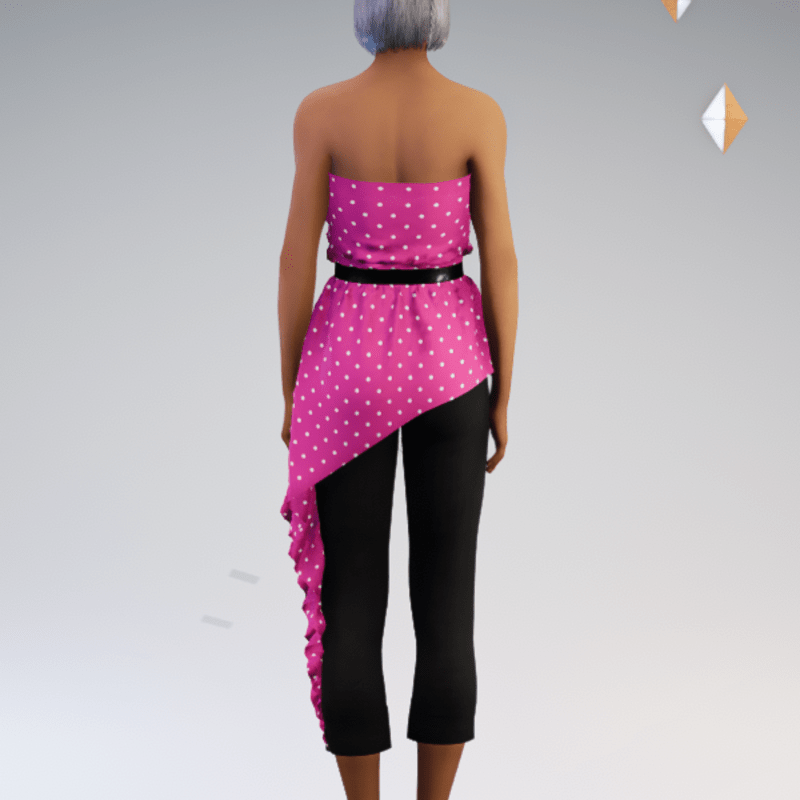 Belted strapless asymmetric blouse and capri pant outfit featuring a polkadot print. by Sweet Distractions
