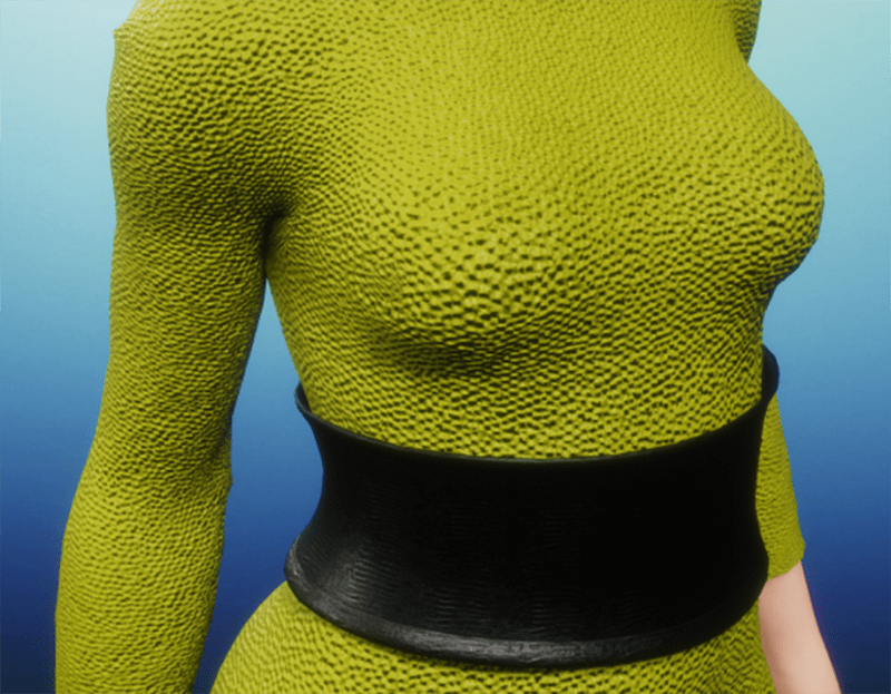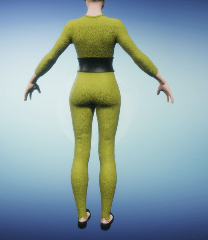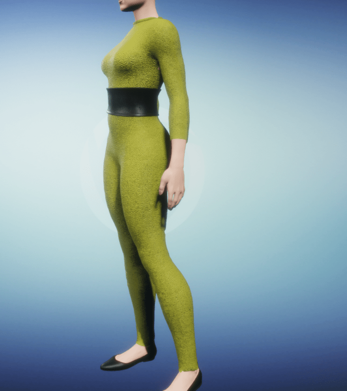 A full-body catsuit made of a nubbly reptilian green skin, featuring a belt of black alligator skin.