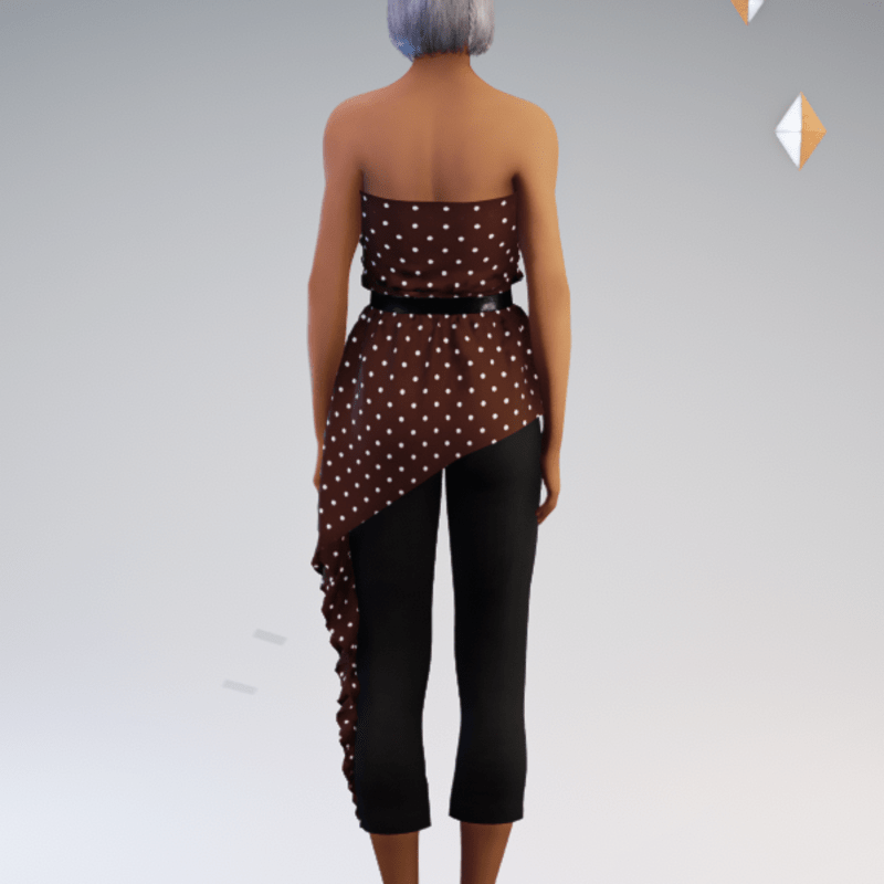 Belted strapless asymmetric blouse and capri pant outfit featuring a polkadot print. by Sweet Distractions