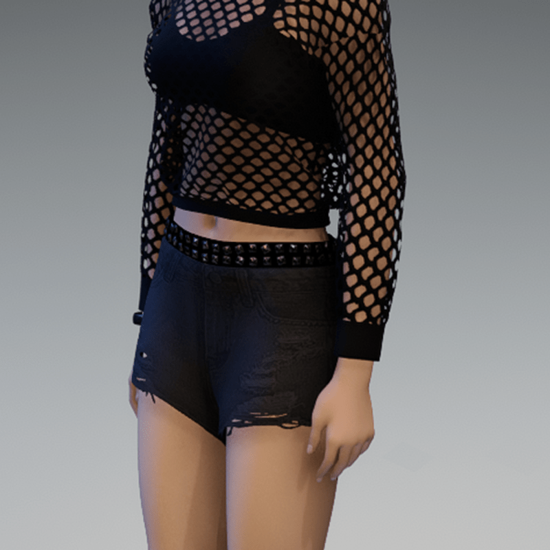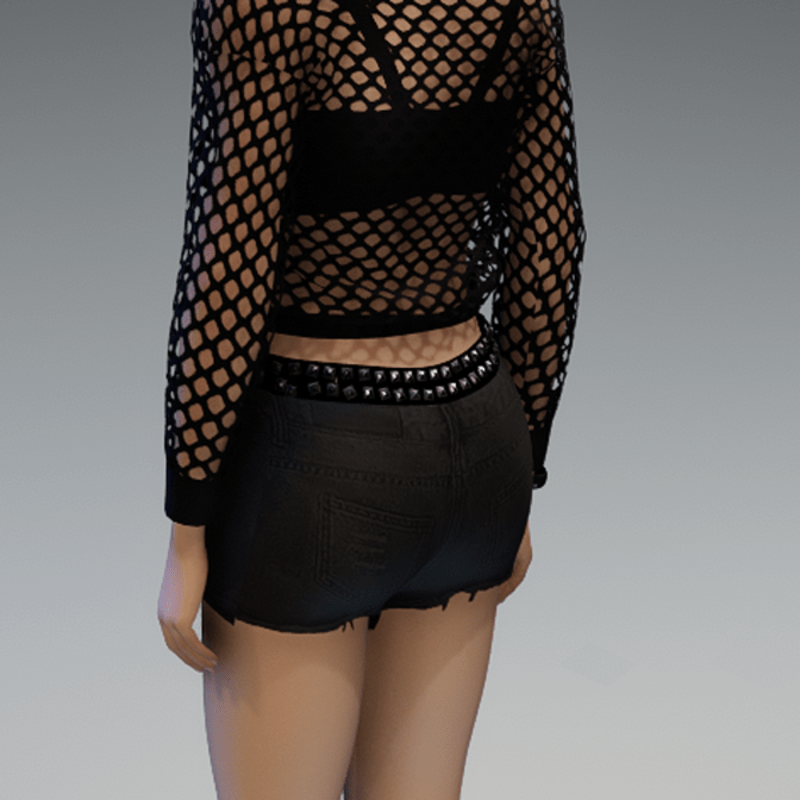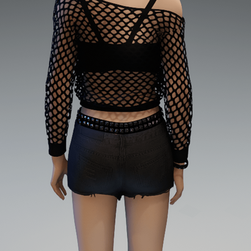 Ripped Short Denim Pants with Rivets Belt Black