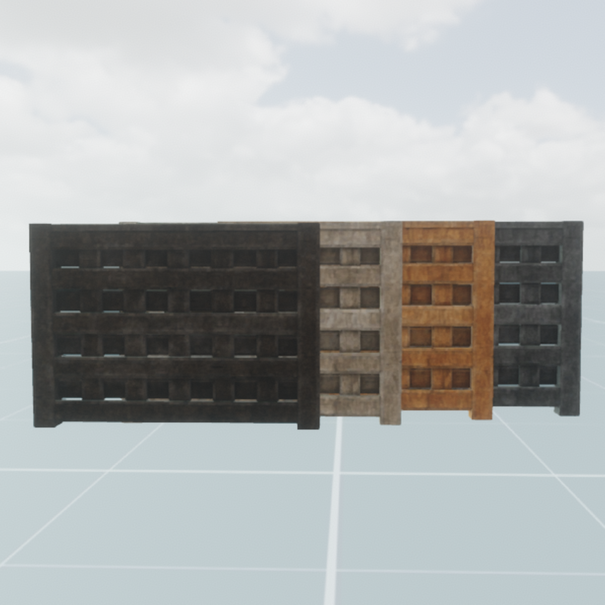 A set of 4 wooden gates with aged textures. See live example: https://atlas.sansar.com/experiences/sammiekiddo/foodcourt
