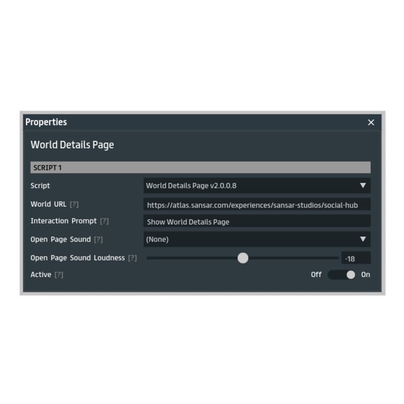 Display a world details page when clicking an object. _____________________________________________________ ** Instructions ** Drop this script in any object in your experience and change the settings to fit the world info. ** Settings ** - World URL: the URL of the world. You can get this value from the 'Copy URL' button on the world details page, from your 'Build Worlds' menu, or from your web browser. - Interaction Prompt: text to display when hovering the object. - Open Store Sound: optional sound to play locally when the world details page is opened - Open Store Sound Loudness: the loudness in decibels of the sound that plays locally when the world details page is opened - Active: toggles the script on or off. ** Changelog ** v2.0.0.8 (2022-09-03) - Revised code ** Questions, issues or suggestions? ** Contact @Tron-Sansar