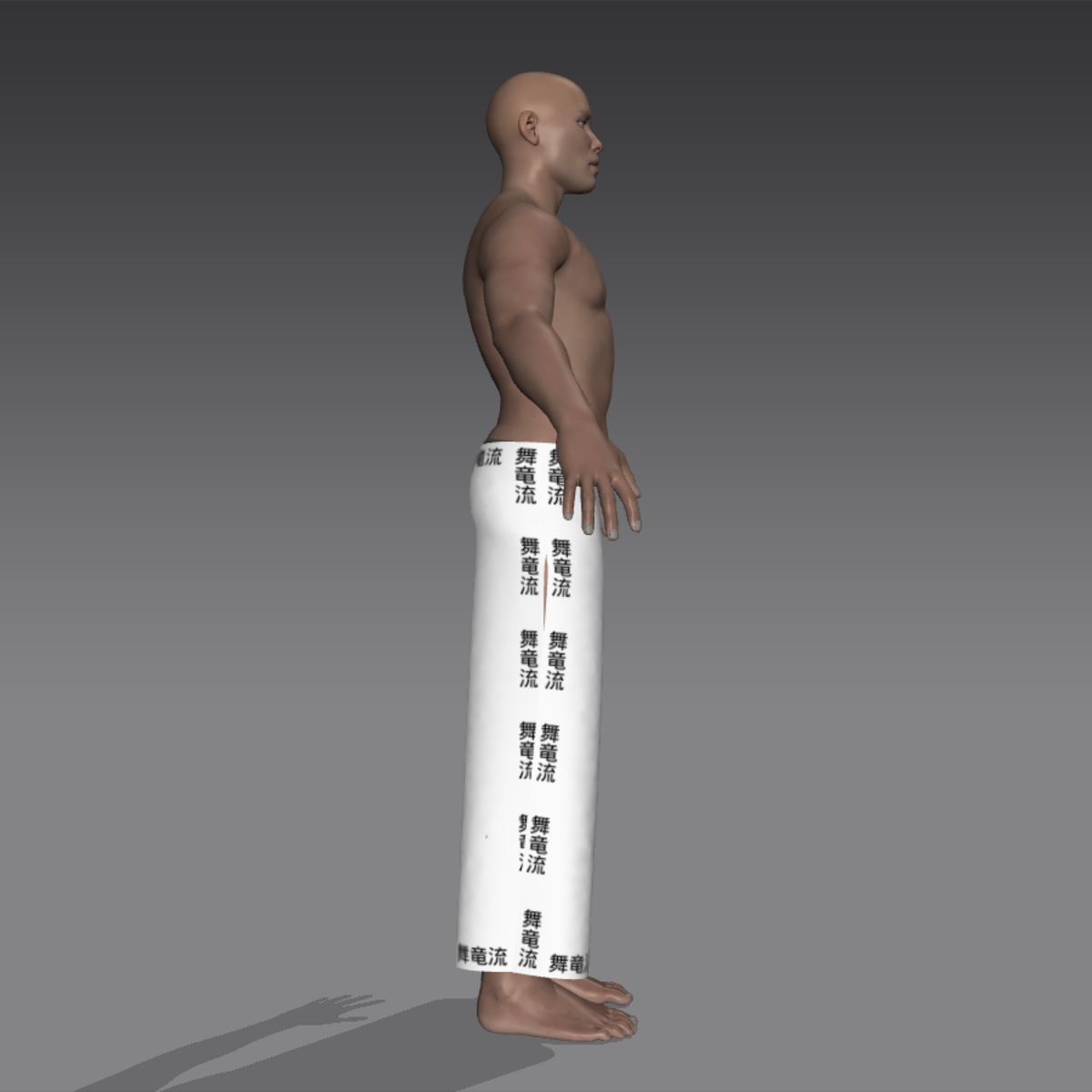 A modern take on fighting pants, similar to yoga pants. Black on white.