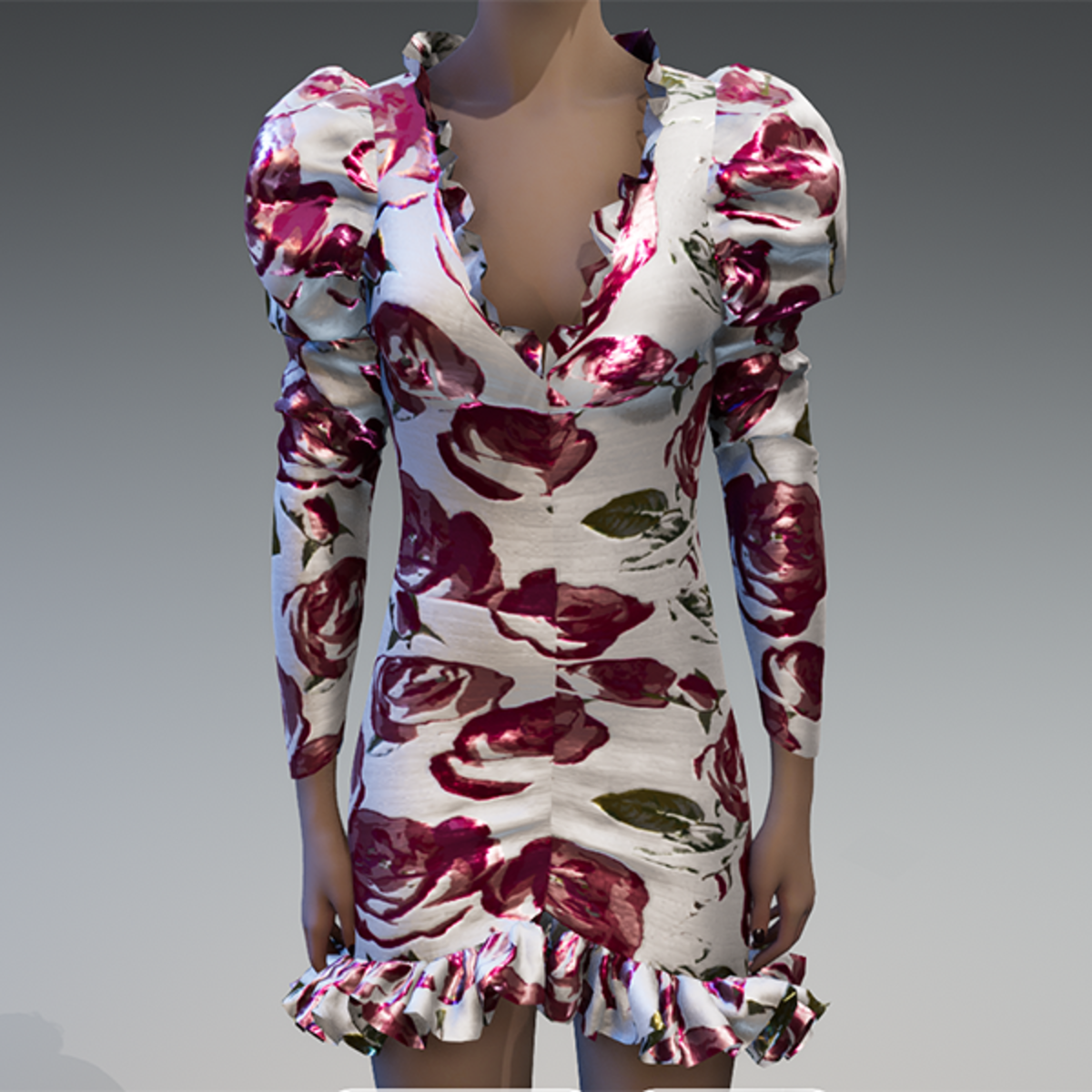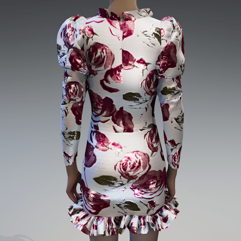 Roses metallic white brocade ruched puff sleeve dress
