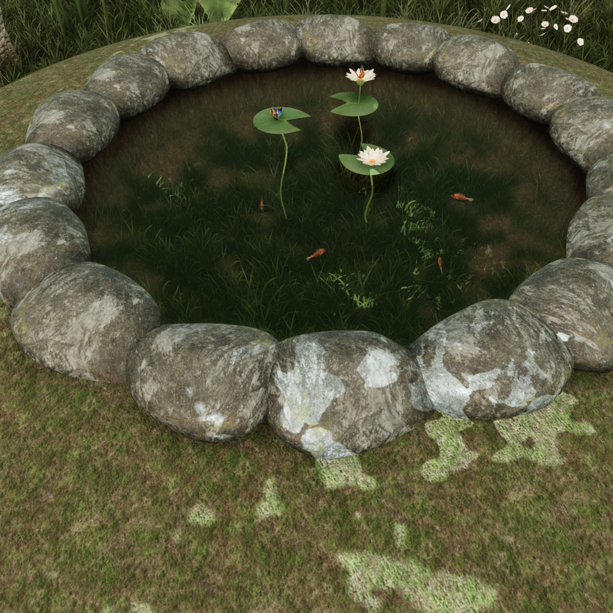 Pond with water (water has no collison). Grass, lilypads, fish and butterflies not included. Normal map included. Enjoy. Water lillies can be found on my store.