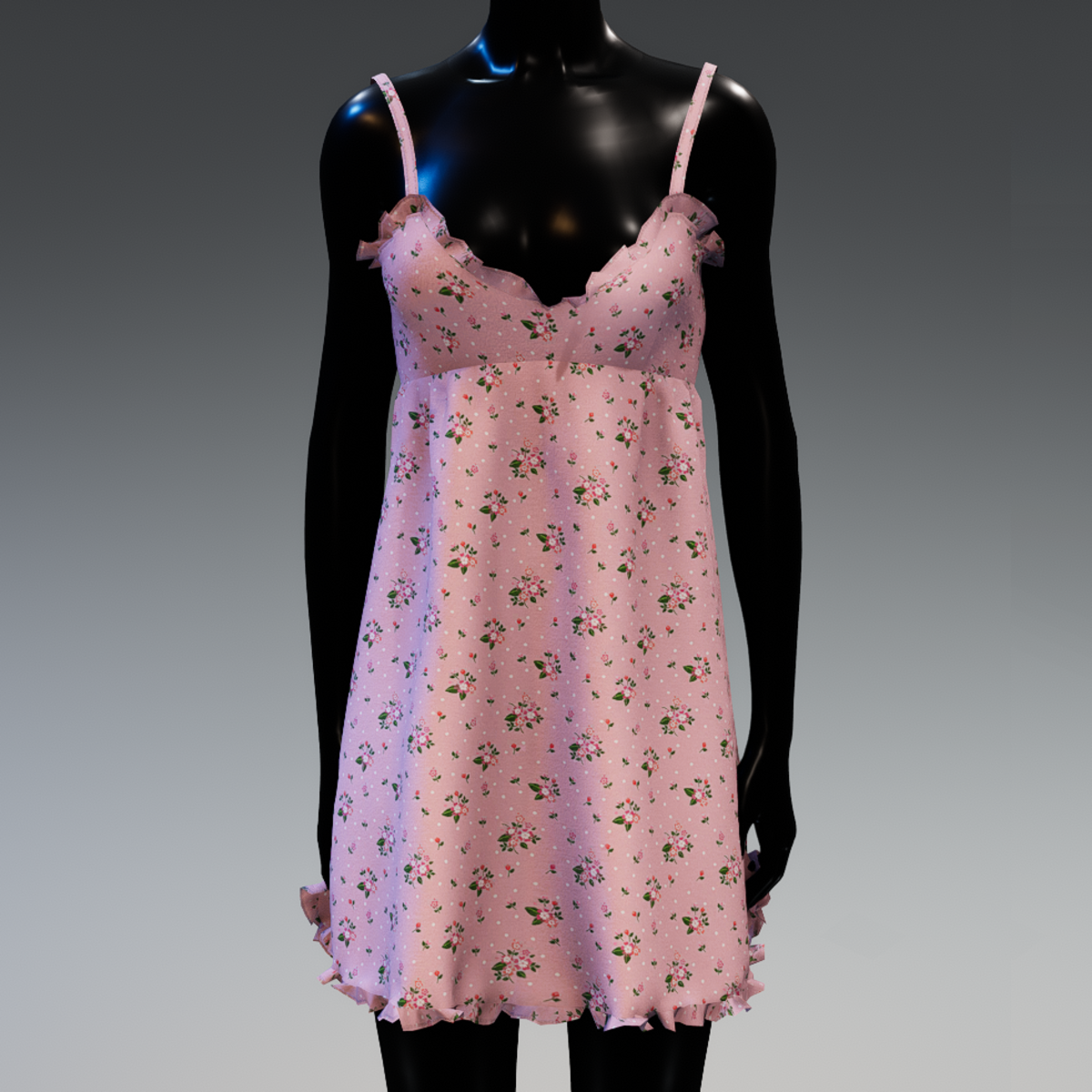 A cute, short nightwear with straps, ruffles in pink colour and small printed flowers.