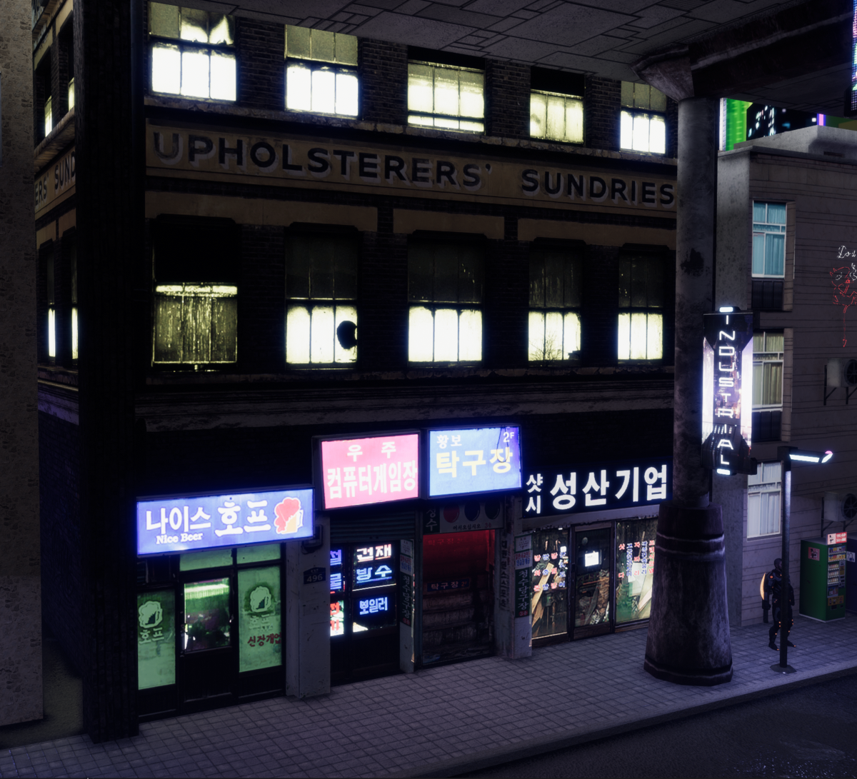 Dystopian building of low rent apartments with Asian themed stores on main level. See a tiny model of it at Lando's Mini Mall https://atlas.sansar.com/experiences/lando/lando-s-freebies