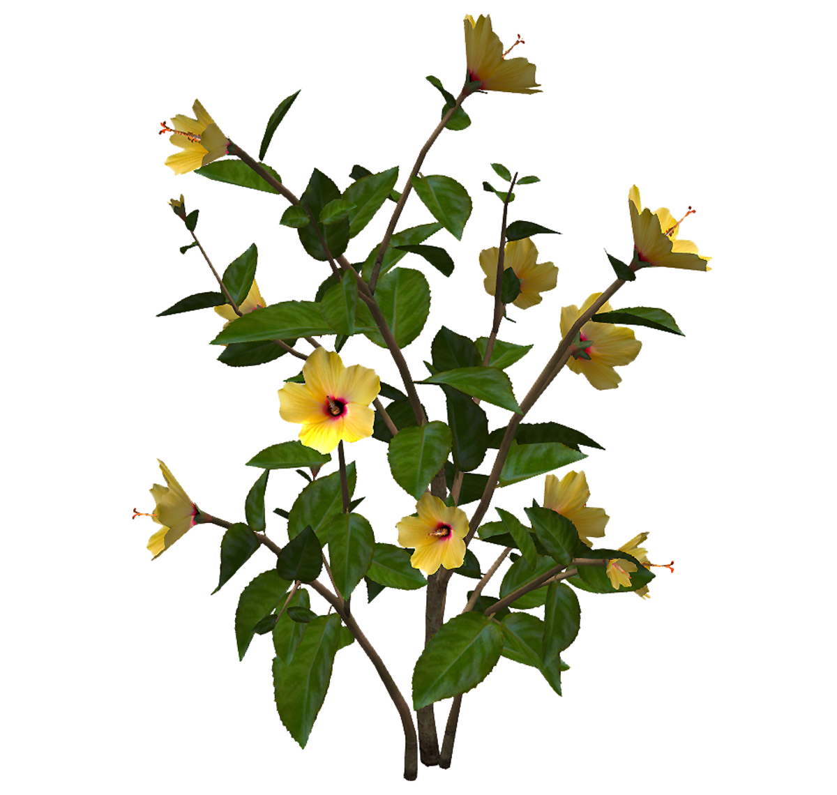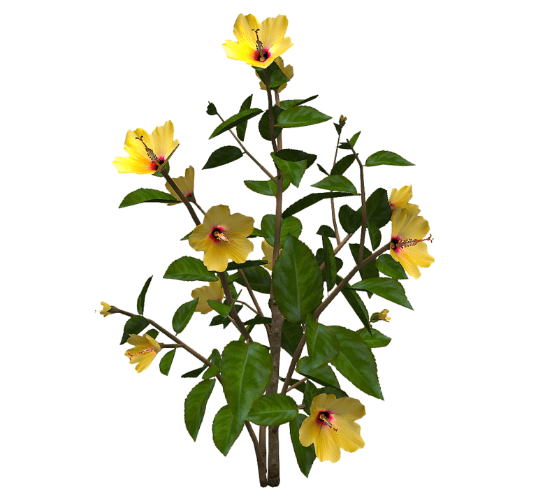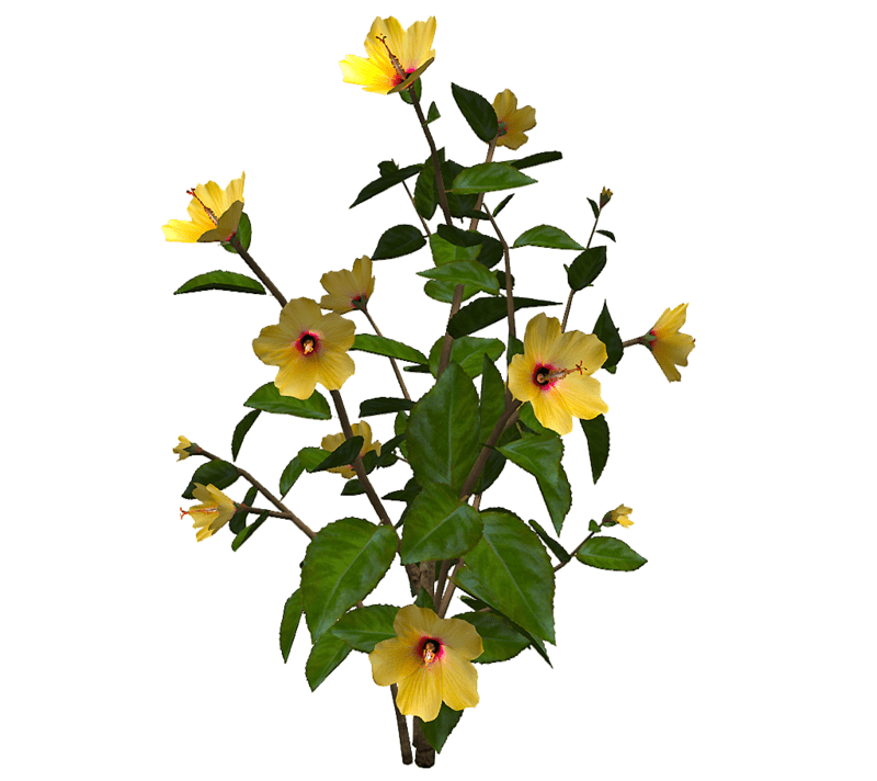 A Hibiscus plant with yellow flowers. Medium size version. 3270 triangles. See in Sansar experience - https://atlas.sansar.com/experiences/reidparkin/reid-s-plants