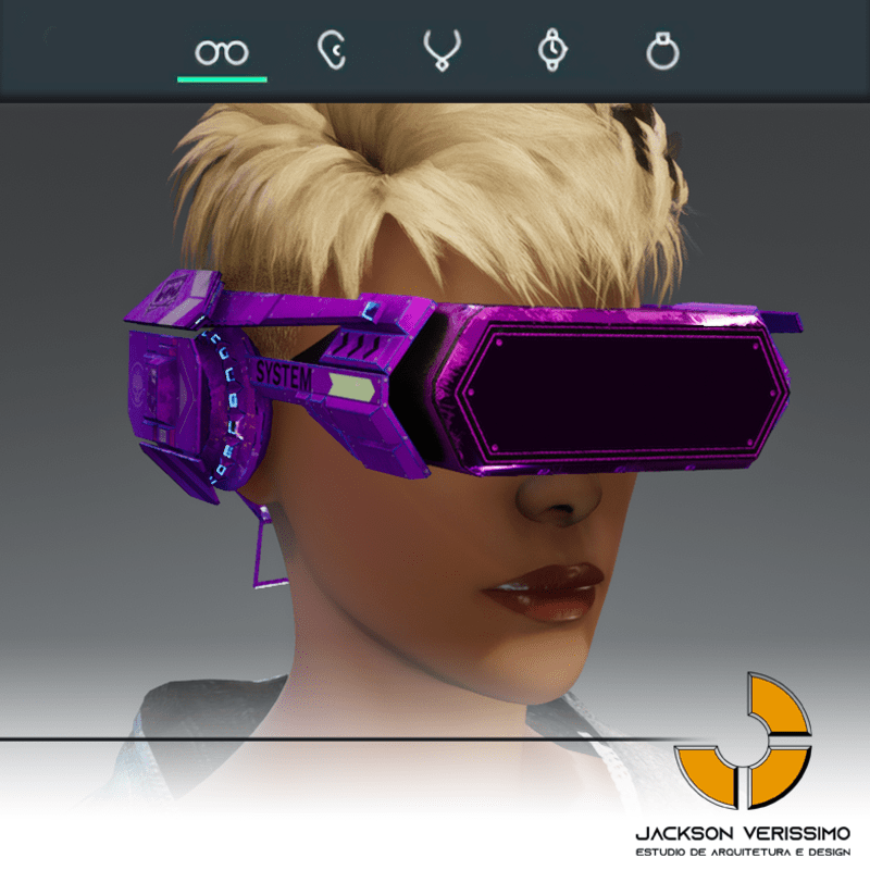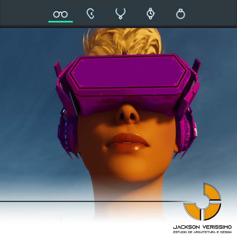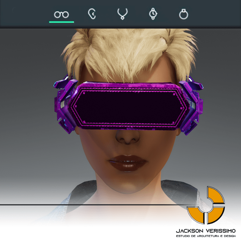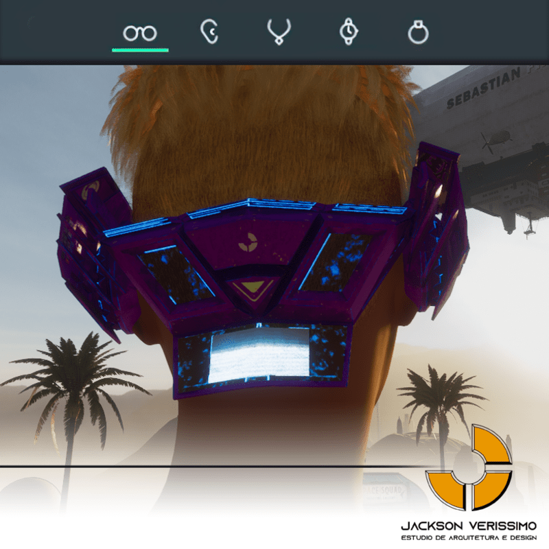 Visionary Design for a VR Headset exclusive for the Sansar Metaverse. Special and High Quality Texture. Vr glasses with headphones, Emissive lights and Media Screen. Unisex. Matches with all humanoid avatars. No need for adjustments for the default 2.0 Avatar of Sansar.
