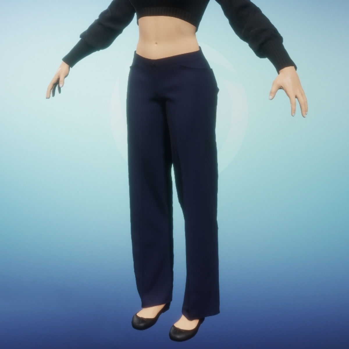 Women's dress slacks with front closure, welt pockets and back patch pockets. Front and back center legs have gently pressed folds for a dressy appearance. Be sure to animate cloth when wearing these slacks. Also, when layering, wear top layers first and then add lower layers. So if wanting to tuck in a shirt, where the shirt first then the slacks. If wanting to wear a top over the slacks wear the top first.