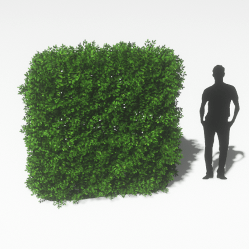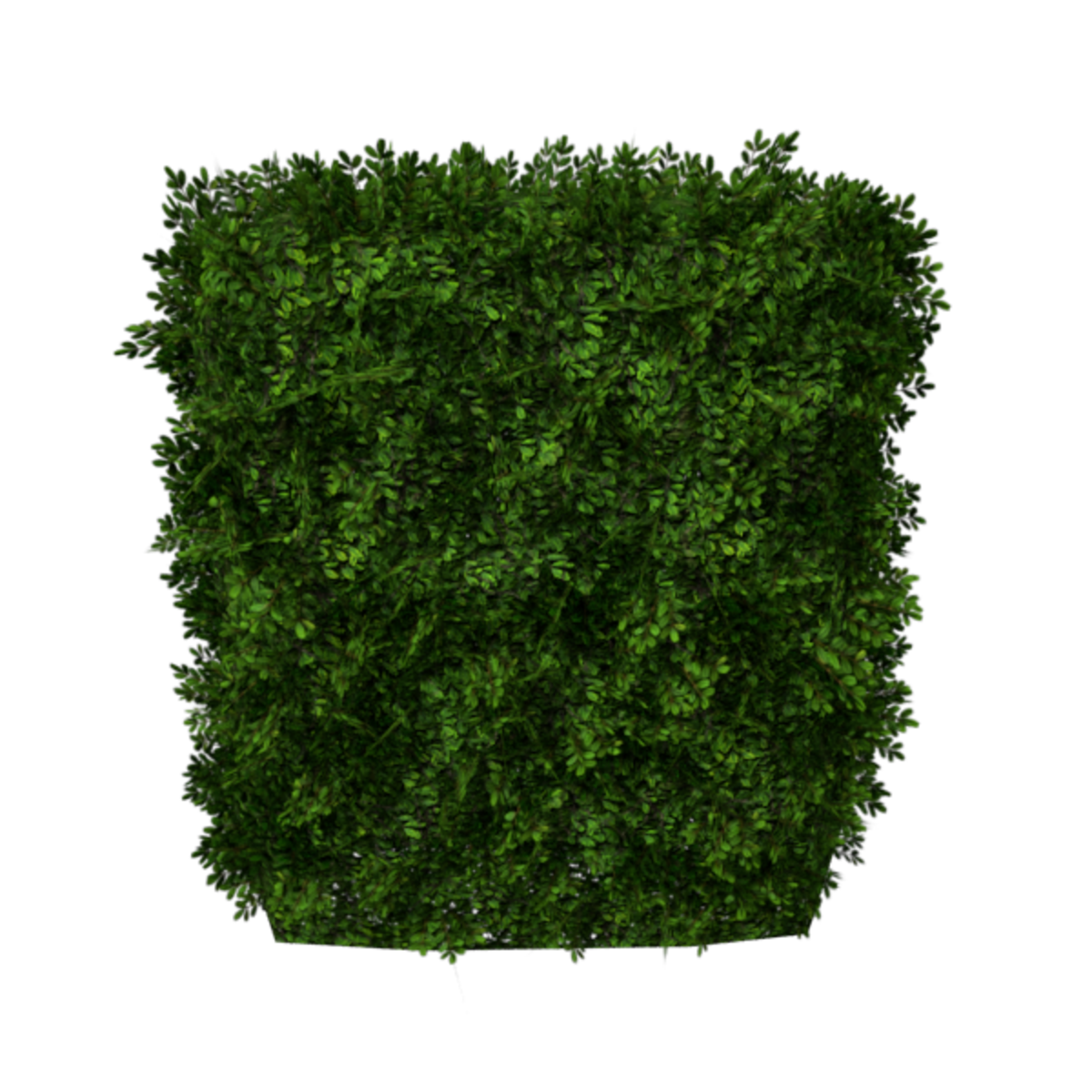 A straight English Boxwood hedge section with vibrant green leaves. Opacity mapped textures are used for base and leaves. Approximately 2m wide, 1m deep and 3m tall. 2228 triangles.