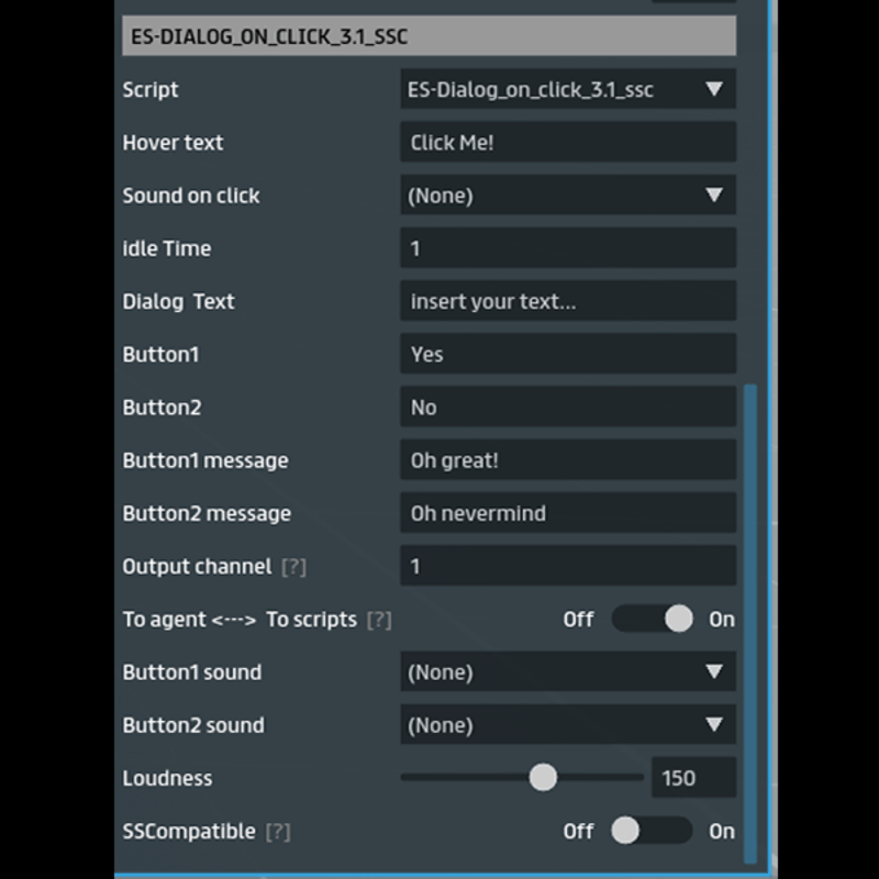 This script permits to click an item, to show a dialog box. It's perfect if you want to add description for an object, or give some information, or send two different commands to other scripts. This script is compatible with Simple Script. HOW TO USE: Put this script inside the object you want to click PARAMETERS TO SET: [HOVERTEXT] Set the hovertext you want to appear on object [SOUND ON CLICK] Add an optional sound that plays when you click the object [IDLE TIME] Time of idleness of script, after clicked [DIALOG TEXT] Insert the main text of dialog [BUTTON 1] Set text of first button [BUTTON 2] Set text of second button [BUTTON 1 MESSAGE] Message sent to agent o script when button 1 is clicked [BUTTON 1 MESSAGE] Message sent to agent o script when button 2 is clicked [OUTPUT CHANNEL] Channel for messages communication. If 0, messages will be published in local chat. [TO AGENTS <--> TO SCRIPTS] Choose if you want messages will be sent to private agent chat, or to other scripts [BUTTON 1 SOUND] Add an optional sound played if button 1 is clicked [BUTTON 2 SOUND] Add an optional sound played if button 2 is clicked [LOUDNESS] Loudness of sounds [SSCOMPATIBLE] If on, messages sent are compatible with Simple Scripts I used it in my experience, "Orphanage of angels" here: https://atlas.sansar.com/experiences/sergiodelacruz/orphanage-of-angels [FIND MY OTHER SCRIPT SEARCHING BY TAG "easyscript"] ★ If you like this item, please support me giving a rate! www.sergiodelacruz.net