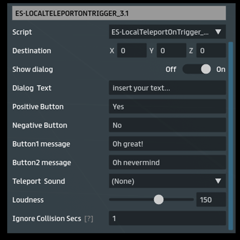 This script teleport an avatar to a specific position in the scene. -HOW TO USE: Insert it inside a trigger volume PARAMETERS TO SET: [DESTINATION] Insert coordinates of your destination point inside the scene. [SHOW DIALOG] If on, a dialog with two buttons will appear on click [POSITIVE BUTTON] Set button text [NEGATIVE BUTTON] Set button text [BUTTON 1 MESSAGE] Add an optional message if positive button is clicked [BUTTON 2 MESSAGE] Add an optional message if negative button is clicked [TELEPORT SOUND] Add an optional sound when you reach the destination. [LOUDNESS] Set loudness of audio file. [IGNORE COLLISION SECS] Choose time of idleness of trigger. I used it in my experience here: https://atlas.sansar.com/experiences/sergiodelacruz/orphanage-of-angels [FIND MY OTHER SCRIPT SEARCHING BY TAG "easyscript"] ★ If you like this item, please support me giving a rate! www.sergiodelacruz.net