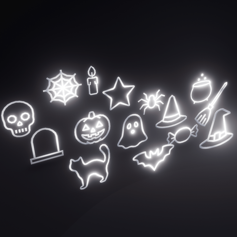 A pack of tint-able neon spooky signs, these are 3D mesh tube shapes not just images, - these are using the Fresnel shader and have some awesome customisability using just the shader properties alone! provided as white for easy tinting, pay attention to the two tint and emissive sliders they allow different colors on the same object!, the uv scale and rotation, also note the bias and exponent slider are affected by camera distance included is 15 shapes shown, drop the pack down and resave each one and any variants you make back to inventory. Make sure to use the bloom setting in your world properties to ensure they look extra glowey