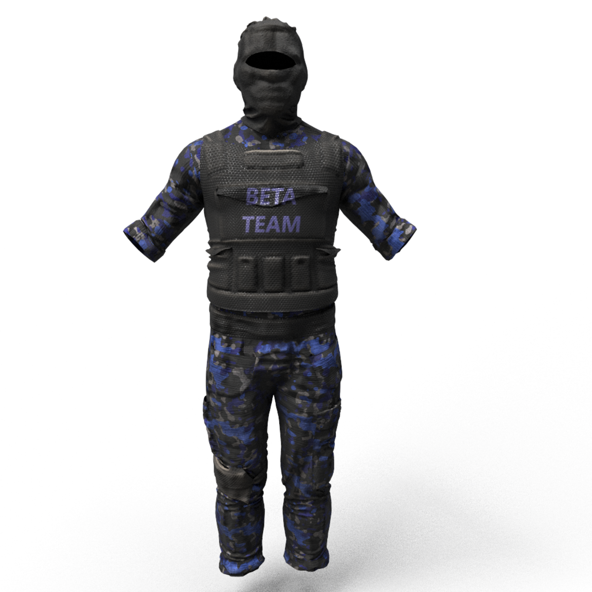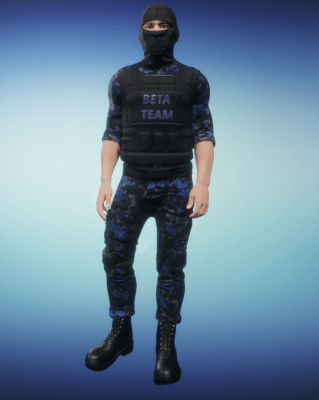 Military Beta TEAM Uniform. # Made for role games # ---Single piece uniform include: balaclava, shirt, bulletproof vest, tactical pants. ---Boots sold separately, you can find them in my store page--- -High quality CGI created by industry professionals- -Top level textures- -You can dynamically simulate this cloth over your avatar to fit your favorite style- -Want the name of your custom team? Contact me: fabeeobreen@gmail.com - Bringing real swag into virtual worlds. Flex your experience!