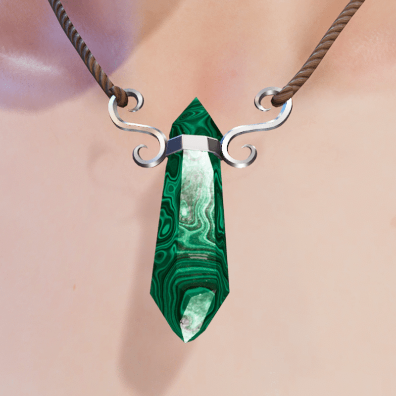 Female fitted glowing Malachite pendant decorated with two silver swirls and hung by Hemp thread. The glow is not constant but a very magical smooth glow that pulses in and out of vision. Made by NovaVoidSpirit Glowing Example Gif: https://gyazo.com/d4bec27f1fe9db45740b2de66ecea866