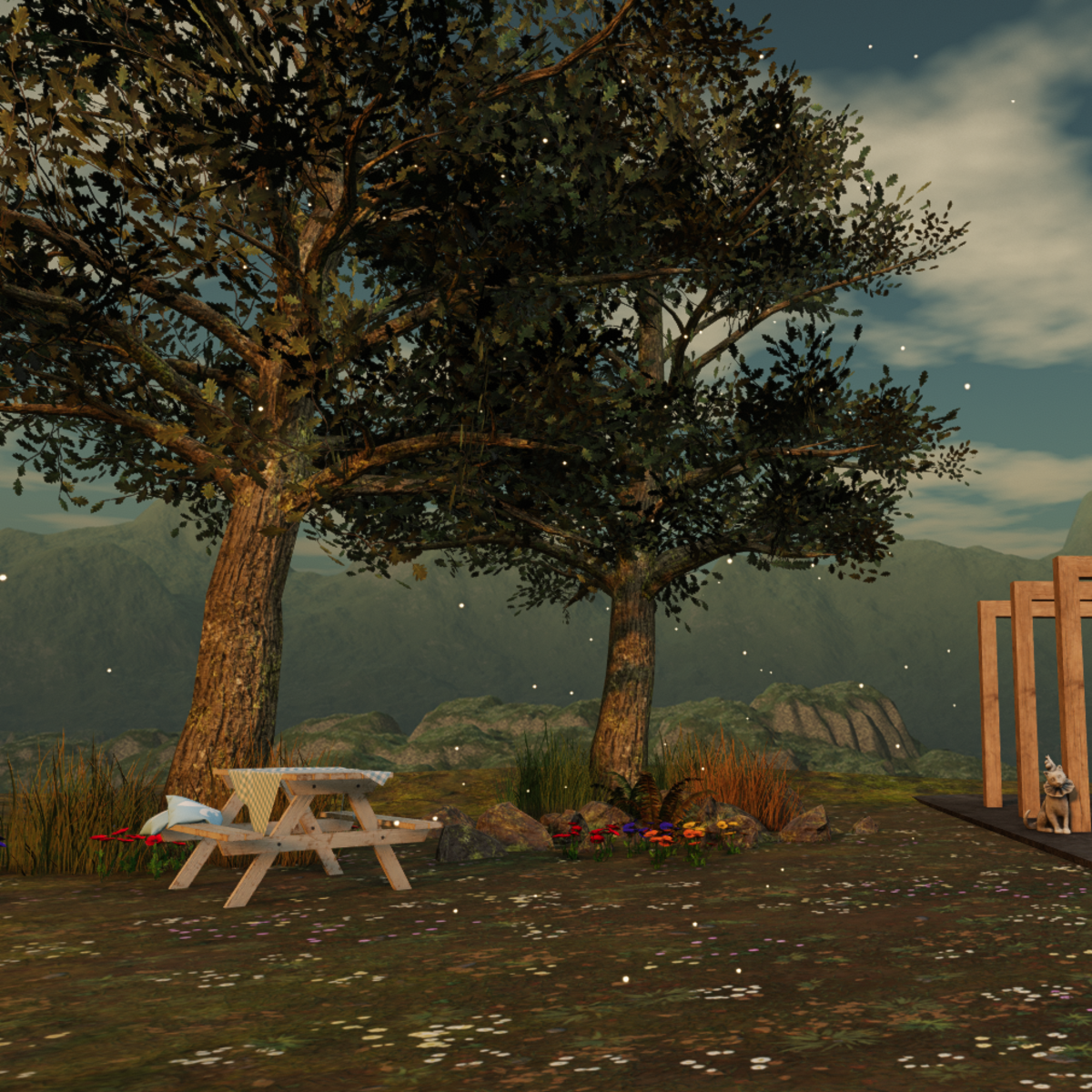 Very small animated lights. They slowly move, giving them something magical. You can adjust the color and animation speed. On the pic they are a bit hard to see, that is how small they are! See here: https://atlas.sansar.com/experiences/bluebell/bluebell-home-garden-wip