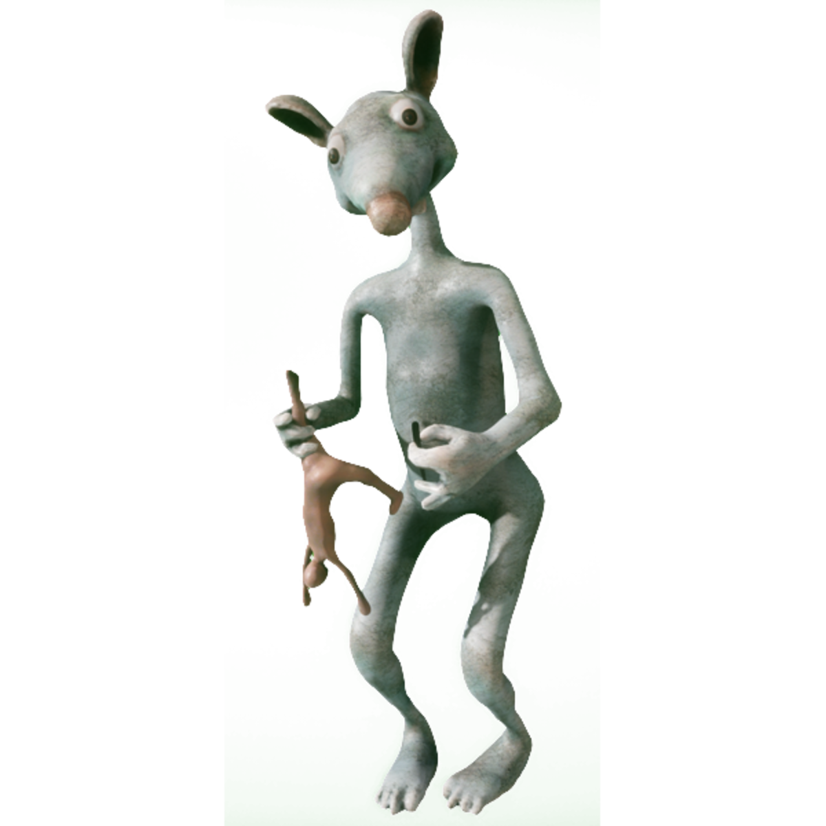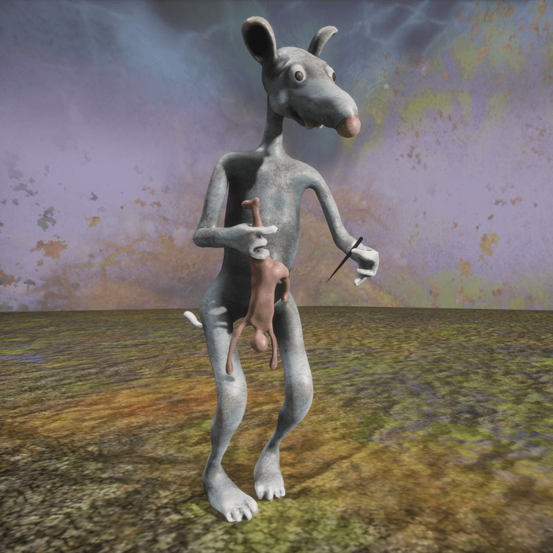 Rat holding a human doll in one hand and a sharp pin in the other. With physics.